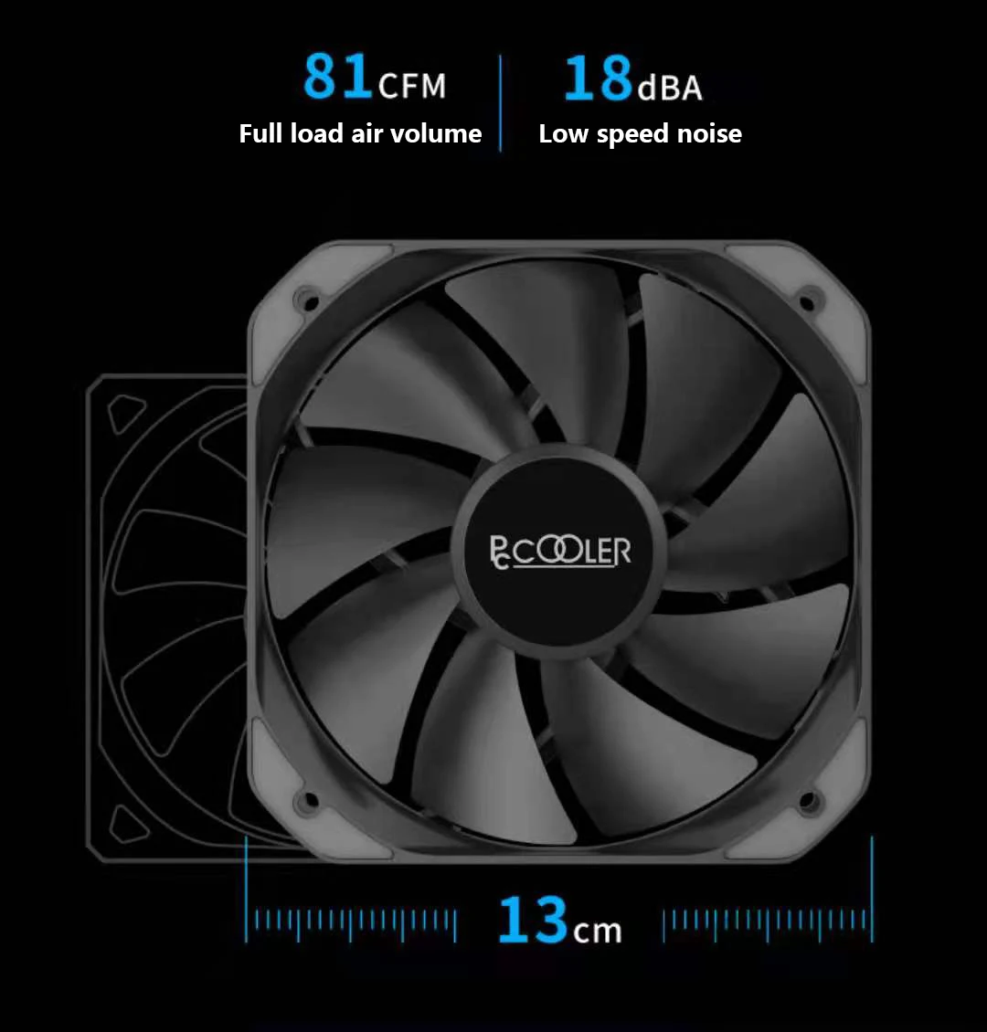 Ventilador de volumen de aire grande de 13CM de la serie PF estándar, compatible con orificios de ventilador de 12CM. Volumen de aire de carga completa de hasta 81CFM, para cumplir con la eficiente disipación del calor en Estado silencioso