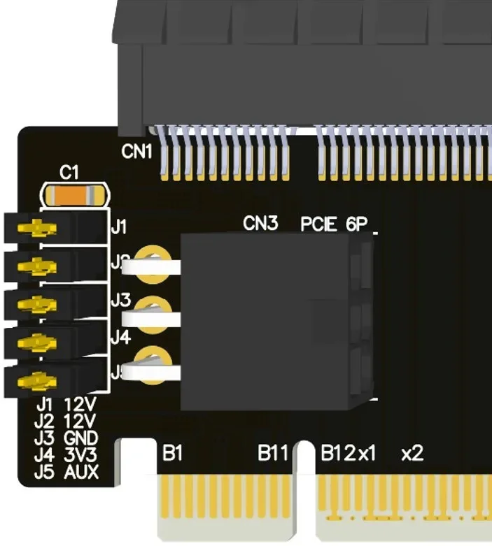 Si necesita utilizar una fuente de alimentación externa, inserte la fuente de alimentación PCIe en la toma de corriente y retire J1 y J2.Cuando no se utilice ninguna fuente de alimentación externa, inserte todas las tapas de puente.