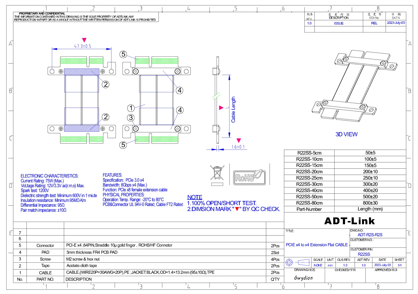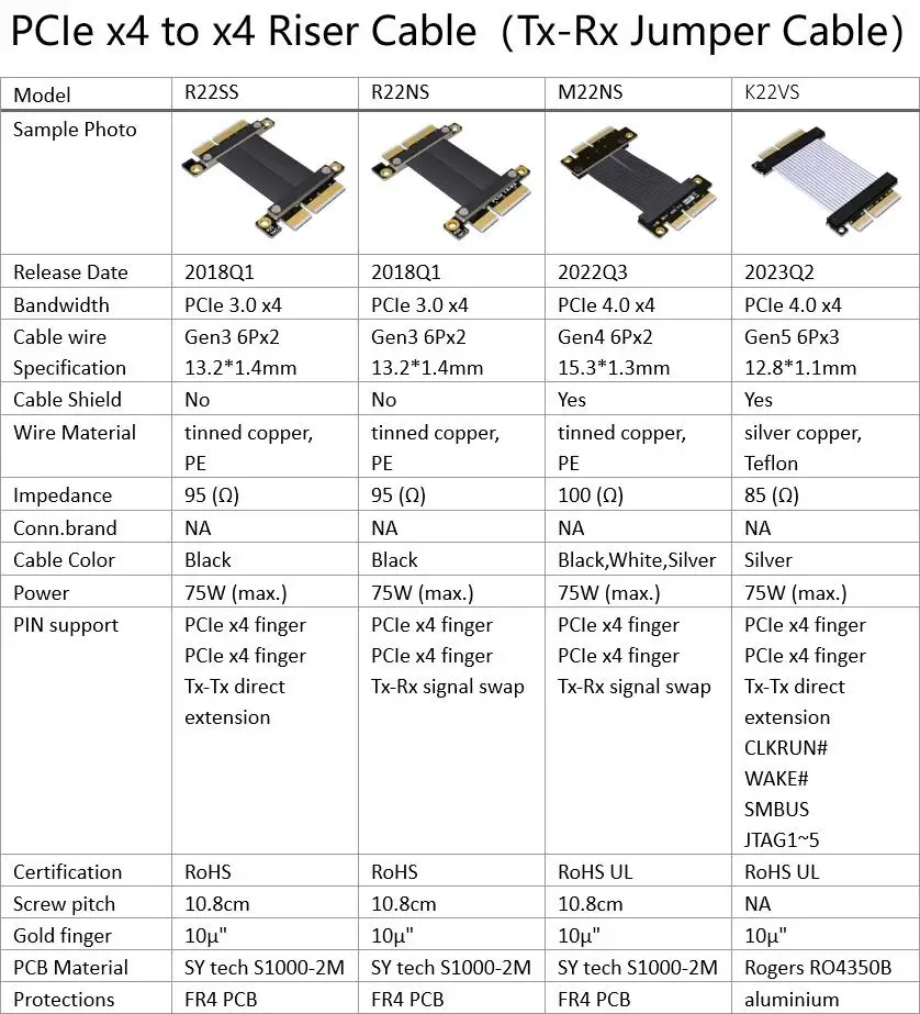 Número de piezaDescripciónAncho de bandaR22SSPCI-E x4, dedo de oro a dedo de oro, extensión directa Tx a TxPCIe 3.0 x4 (32G/bps)R22FFPCI-E x4, conector a conector, extensión directa Tx a TxPCIe 3.0 x4 (32G/bps)R22LRPCI-E x4, conector a conector, extensión directa Tx a TxPCIe 3.0 x4 (32G/bps)R22NSPCI-E x4,dedo doradoal dedo dorado, intercambio de señal Tx a RxPCIe 3.0 x4 (32G/bps)R22NFPCI-E x4, conector adedo dorado, Intercambio de señal Tx a RxPCIe 3.0 x4 (32G/bps)R22NLPCI-E x4, conector adedo dorado, Tx a Rxintercambio de señalPCIe 3.0 x4 (32G/bps)R22NRPCI-E x4, conector adedo dorado, Tx a Rxintercambio de señalPCIe 3.0 x4 (32G/bps)