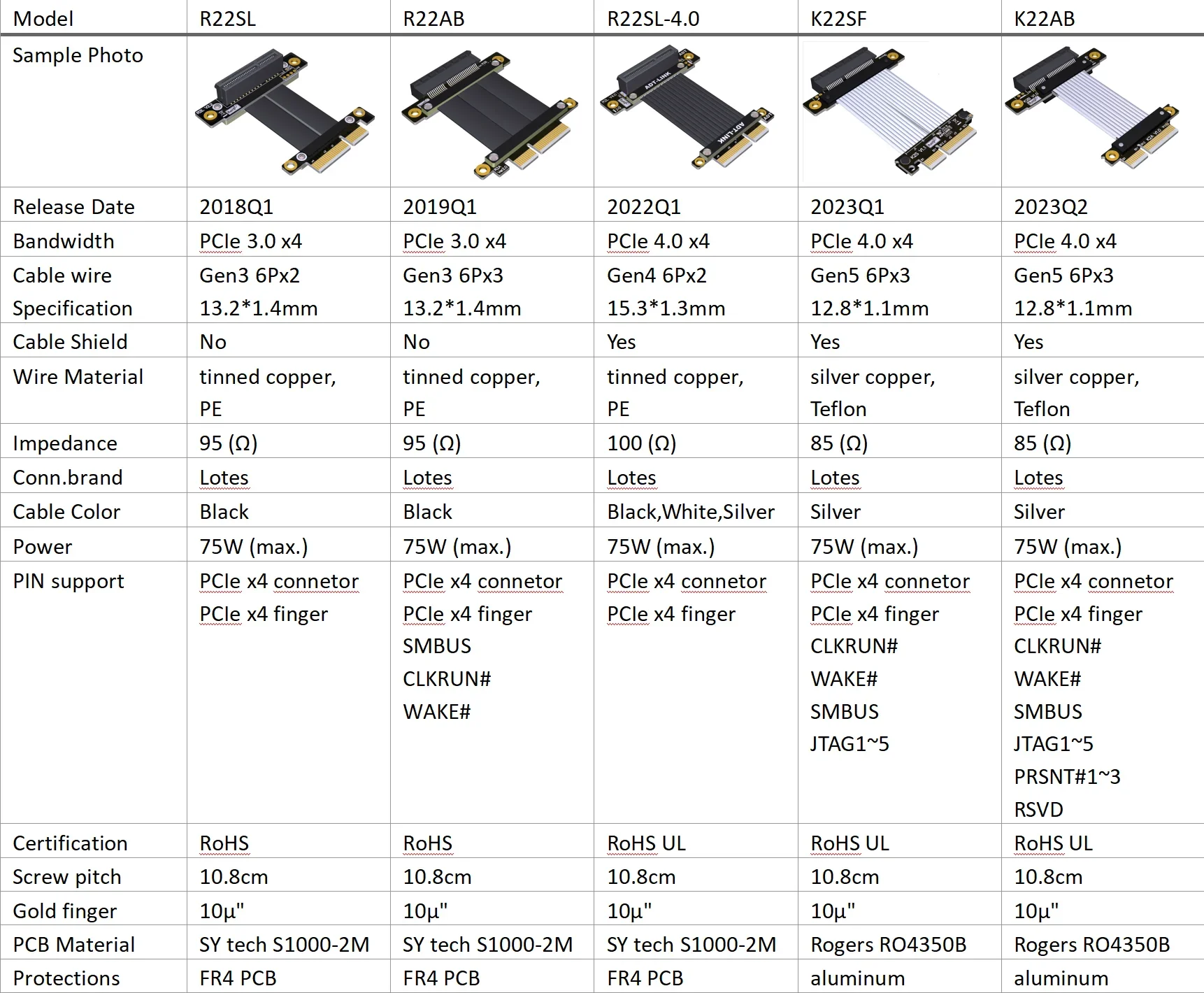 Número de piezaDescripciónAncho de bandaK22ABLos Cables verticales de férula PCI-E X4 a X4 giran 180 grados admiten SMBUS, WAKE #PCIe 4,0x4 (64G/BPS)R22ABLos Cables verticales de férula PCI-E X4 a X4 giran 180 grados admiten SMBUS, WAKE #PCIe 3,0x4 (32G/BPS)R22: PCIe X4 a X4