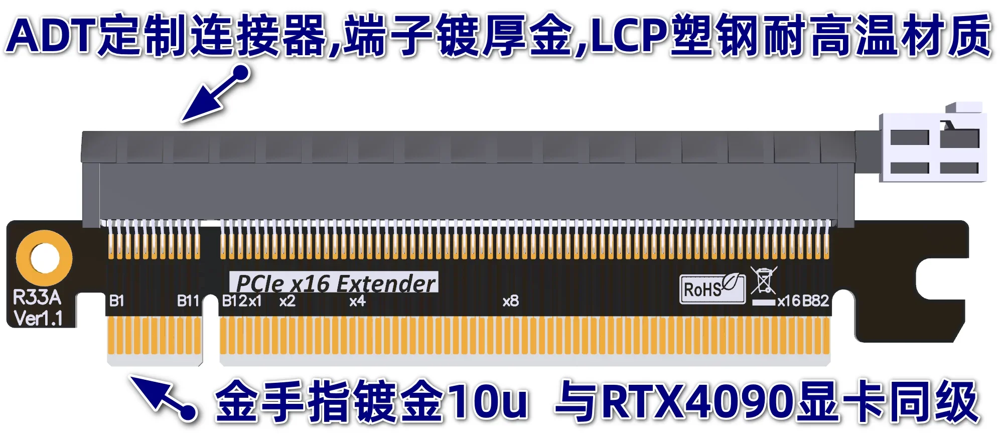 1.Compatible con PCIE 4.0 X16 compatible con gen3/gen4 2.Proceso de chapado en oro con dedo dorado, espesor de oro hasta 10u" 3.Lotes conector PCIe gen4, el terminal aumenta el espesor del oro, material de acero plástico ignífugo LCP de alta temperatura, con hebilla 4.Placa PCB de alta frecuencia, baja resistencia, alta temperatura y antioxidante, sin deformación, color, citrino, translúcido, blanco o negro 5.Definición de pines uno a uno, buena compatibilidad