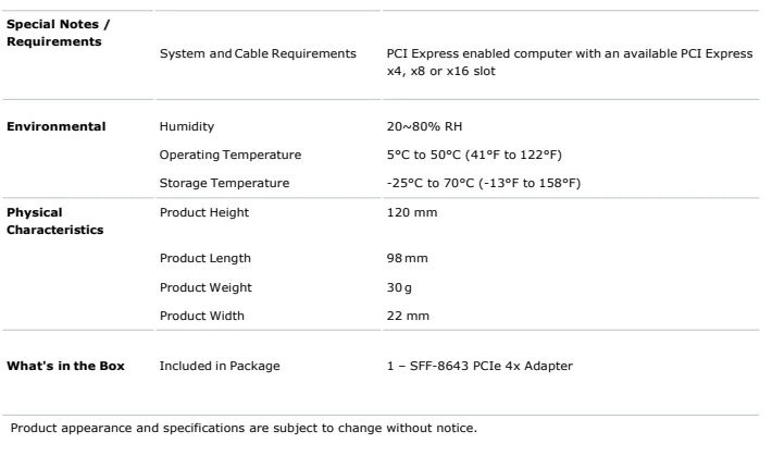 El adaptador SFF-8643 PCIe 4x está diseñado para conectar NVMe U.2 de alto rendimiento de 2,5''