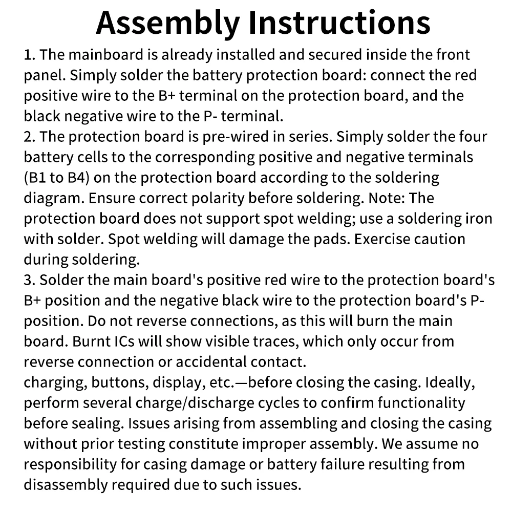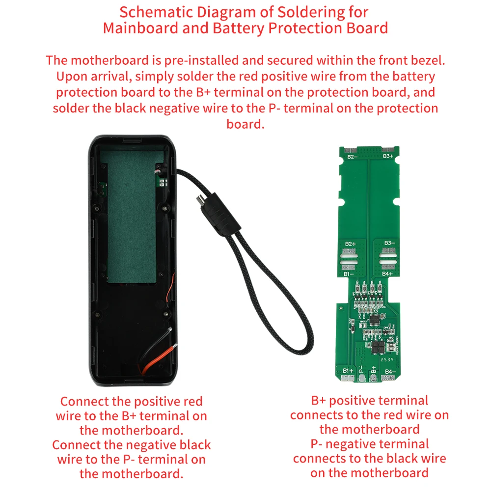 1.La placa base está preinstalada y asegurada dentro de la cubierta frontal.Simplemente suelde la placa de protección de la batería: conecte el cable positivo rojo al terminal B+ en la placa de protección y el cable negativo negro al terminal P-.