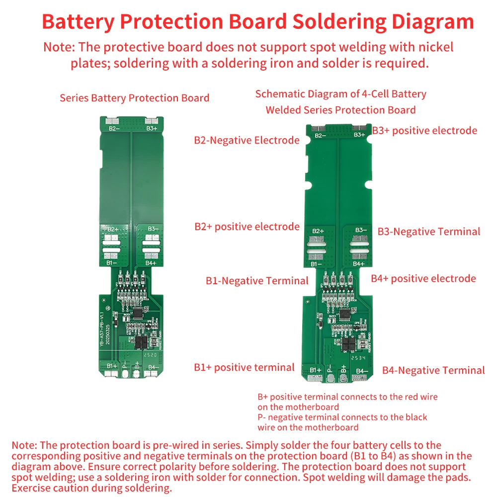 2.La placa de protección está precableada en serie.Simplemente suelde las 4 celdas de la batería a los terminales positivo y negativo correspondientes (B1 a B4) en la placa de protección de acuerdo con el diagrama de soldadura.Asegúrese de que la polaridad sea correcta antes de soldar.El tablero de protección no admite soldadura por puntos; utilizar un soldador con soldadura.La soldadura por puntos dañará las almohadillas.Tenga cuidado durante la soldadura.