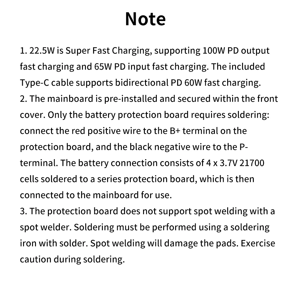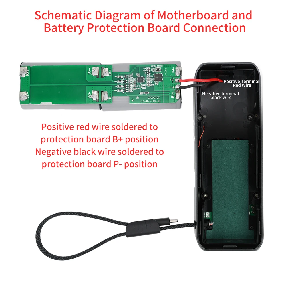 2.La placa base está preinstalada y asegurada dentro de la cubierta frontal.Sólo la placa de protección de la batería necesita soldadura: conecte el cable positivo rojo al terminal B+ en la placa de protección y el cable negativo negro al terminal P-.La conexión de la batería consta de 4 celdas de 3,7 V 21700 soldadas a una placa de protección en serie, que luego se conecta a la placa base para su uso.