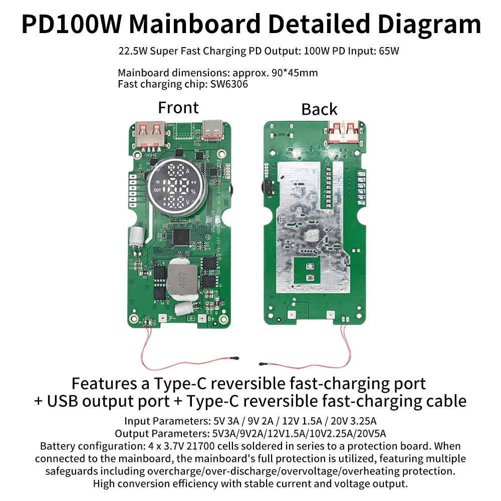 Características de la placa base: Protección integral que incluye protecciones contra sobrecarga/sobredescarga/sobretensión/sobrecalentamiento.Alta eficiencia de conversión con salida estable de corriente y voltaje.