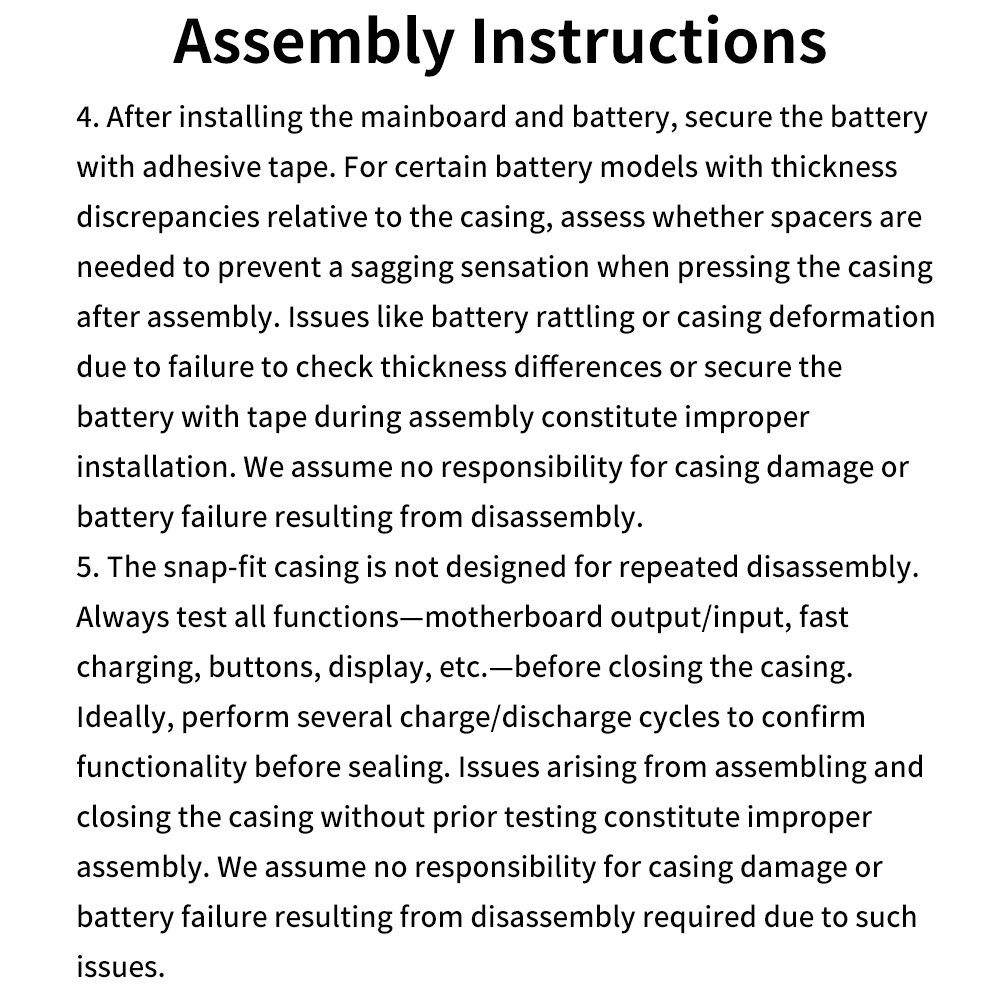 5.La carcasa a presión no está diseñada para desmontarlos repetidamente.Pruebe siempre todas las funciones: salida/entrada de la placa base, carga rápida, botones, pantalla, etc. antes de cerrar la carcasa.Lo ideal es realizar varios ciclos de carga/descarga para confirmar la funcionalidad antes del sellado.Los problemas derivados del montaje y cierre de la carcasa sin pruebas previa constituyen un montaje inadecuado.No asumimos ninguna responsabilidad por daños en la carcasa o fallas de la batería resultantes del desmontaje requerido debido a dichos problemas.