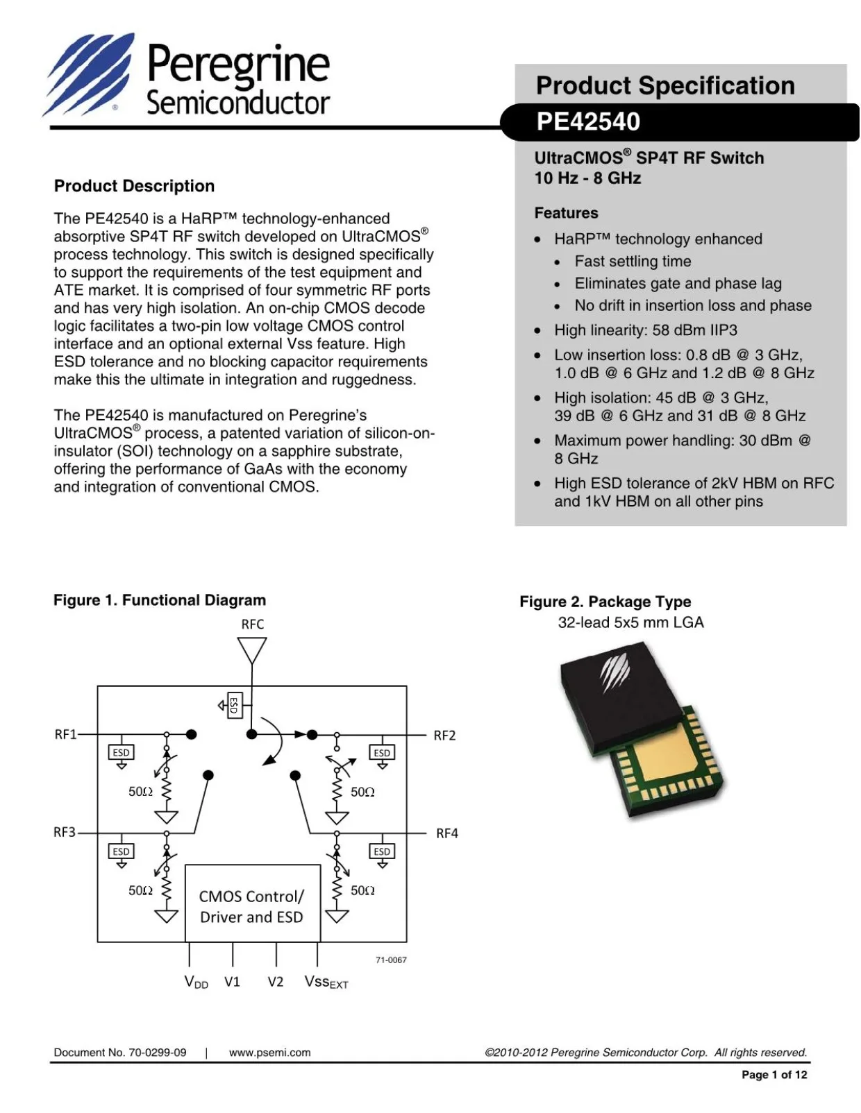 El PE42540 es un interruptor RF SP4T desarrollado. Este interruptor está diseñado específicamente para respaldar los requisitos del mercado de equipos de prueba yATE.Está compuesto por cuatro puertos RF simétricos y tiene un aislamiento muy alto. Una decodelic CMOS en chip facilita una interfaz de control CMOS de bajo voltaje de dos pines y una función Vss externa opcional.La alta tolerancia EXD y los requisitos sin capacitores de bloqueo hacen de esto lo último en integración y robustez.