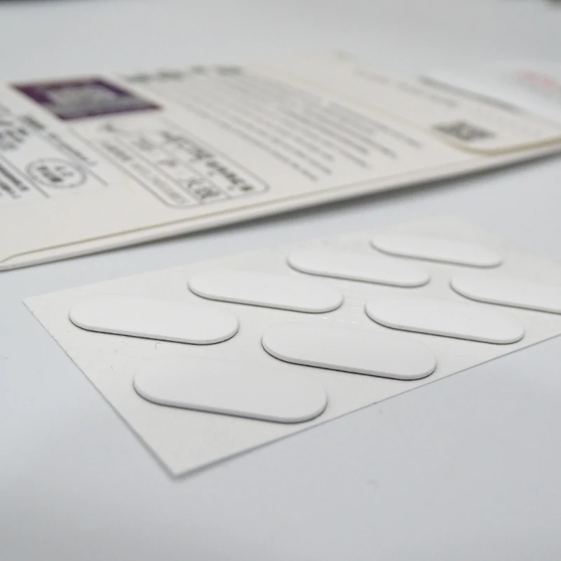Después de quitar la película protectora transparente en los pies del ratón, cuidadosamente los pies en la parte inferior del ratón para la cáscara, luego aplique una ligera presión para ajustar el pie.
