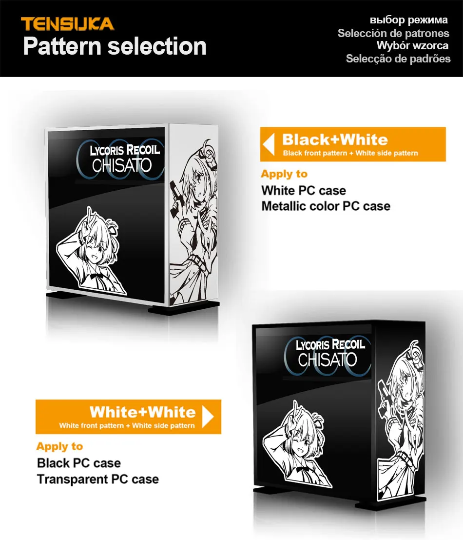 4. Este producto incluye una pegatina con patrón frontal, una pegatina de cristal lateral y una pegatina con texto.Seleccione la pegatina adecuada para el color de la carcasa de su PC según la ilustración.
