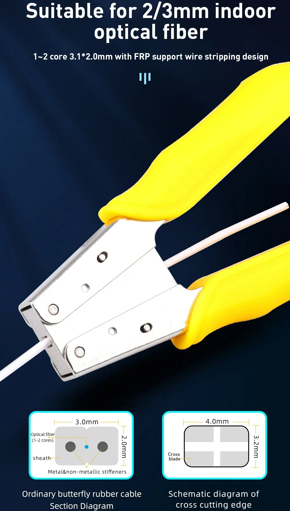 Perfecto para fibras ópticas de interior de 2 mm a 3 mm, pela eficazmente 1 o 2 cables centrales con un diámetro de 3,1 x 2,0 mm, adaptándose a varios tipos de fibras.