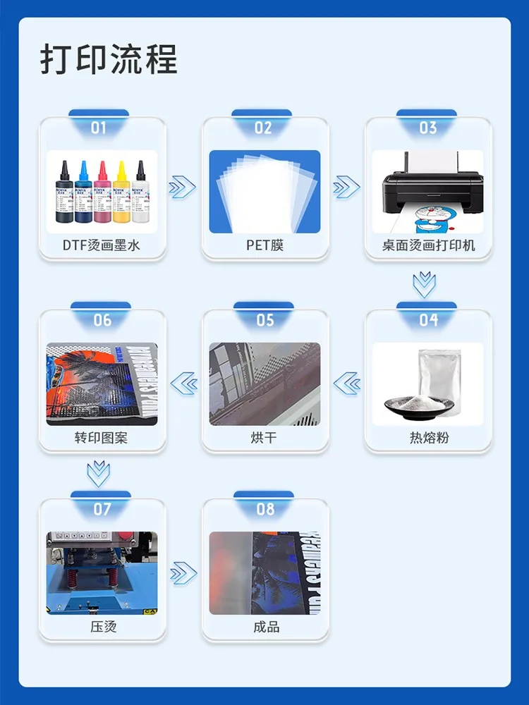 1.Modifique una impresora Epson a una impresora DTF o compre una impresora DTF con nosotros.Y prepare máquinas de prensado en caliente, láminas de prensado en caliente, horno, software AcroRip9.03 y kit de consumibles (tinta DTF, polvo termofusible, películas PET, limpiador, etc.)