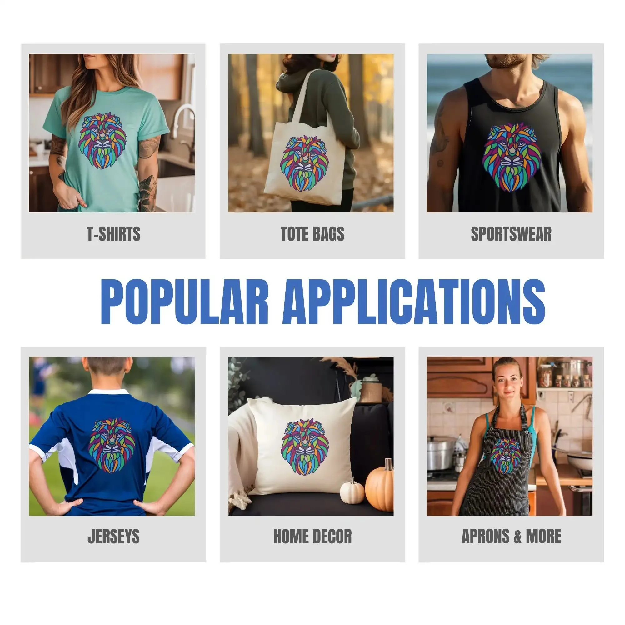 Las láminas de película de transferencia DTF funcionan para todas las prendas de colores, incluido el color negro oscuro, blanco claro, etc., también para todos los materiales de tela, incluidos algodón, jeans, cuero, mezclas, spandex, nailon, lona, poliéster, etc.Un producto favorito de la industria.