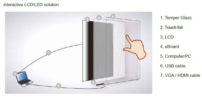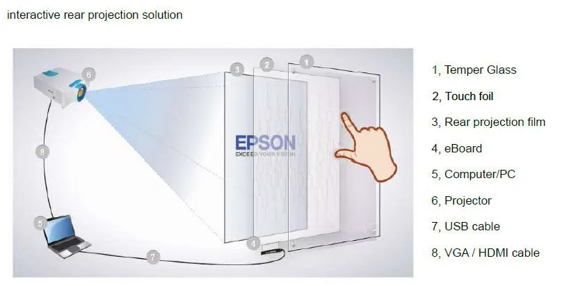 La película de lámina táctil interactiva es una película transparente sensible al tacto, fijada a la membrana en la parte posterior del vidrio o placa de acrílico transparente, los paneles de vidrio o cristal pueden transformar instantáneamente el tamaño de la pantalla táctil.
