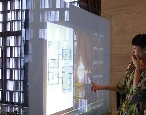 La película de lámina táctil interactiva es una película transparente sensible al tacto, fijada a la membrana en la parte posterior del vidrio o placa de acrílico transparente, los paneles de vidrio o cristal pueden transformar instantáneamente el tamaño de la pantalla táctil.
