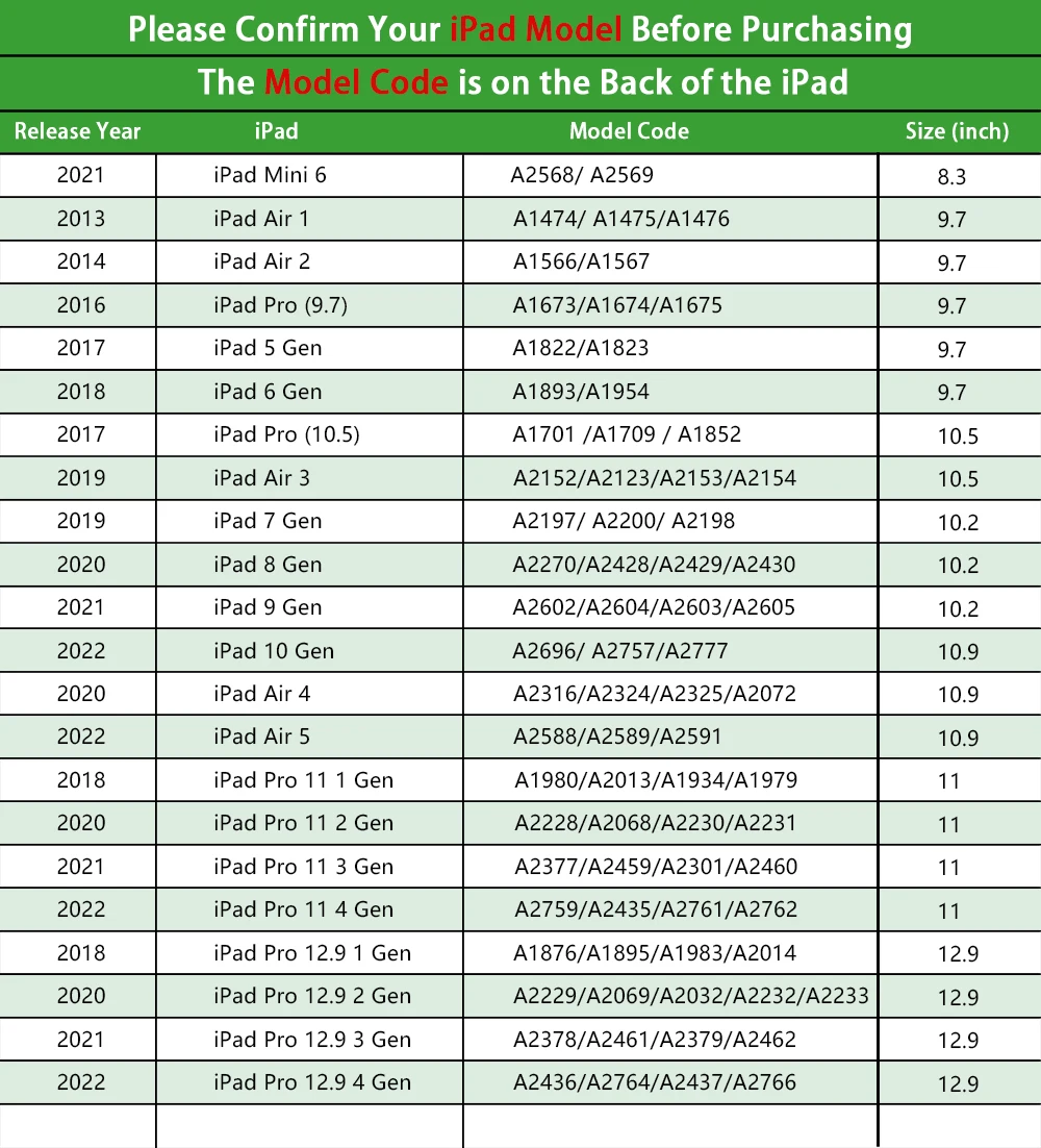Comprueba el modelo de tu iPad antes de comprar. Se encuentra en la parte posterior del iPad, modelo A***. ¡Contáctenos si tiene alguna pregunta después de recibir el producto!
