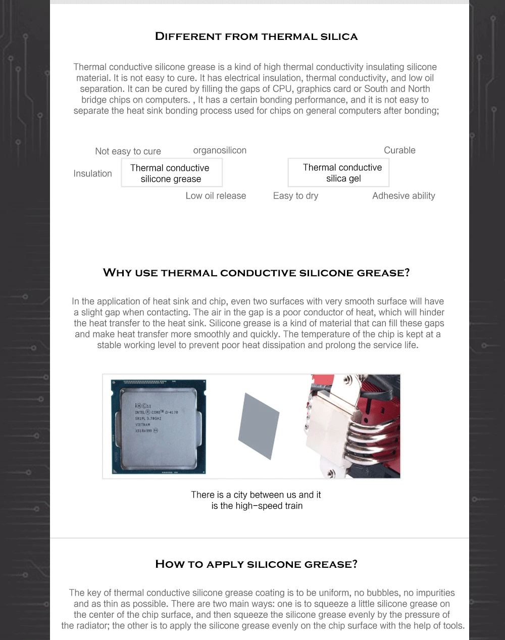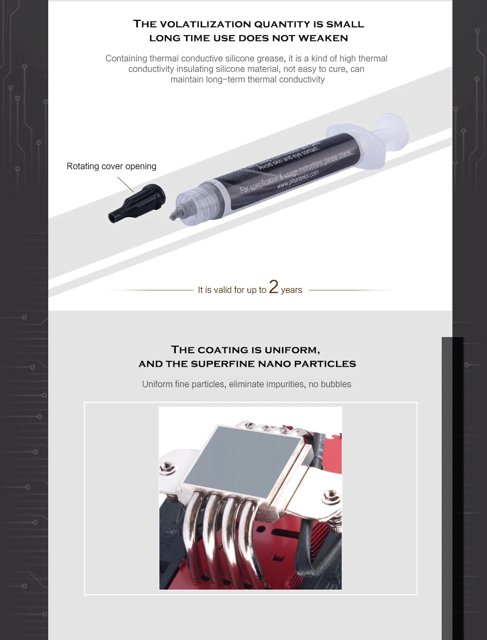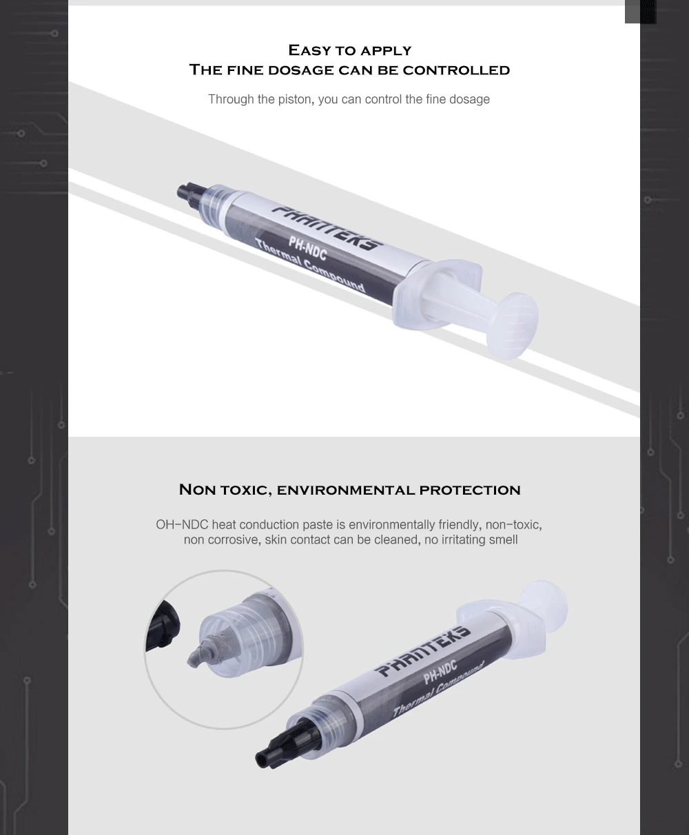 El PH-NDC se puede aplicar a cualquier tipo de enfriador para mejorar la conductividad térmica. El producto no contiene ningún metal ni otros materiales conductores de electricidad que dañen otros componentes.