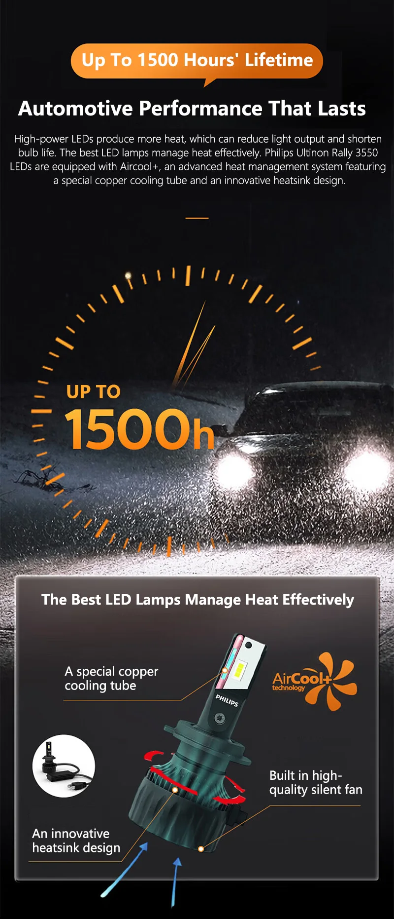 Show your passion. Show your style in the dark. Philips Ultinon Rally 3550 gives you 50 watts of powerful white LED light where you need it. The smart cooling system and Philips quality design give you ultra-high brightness that lasts.