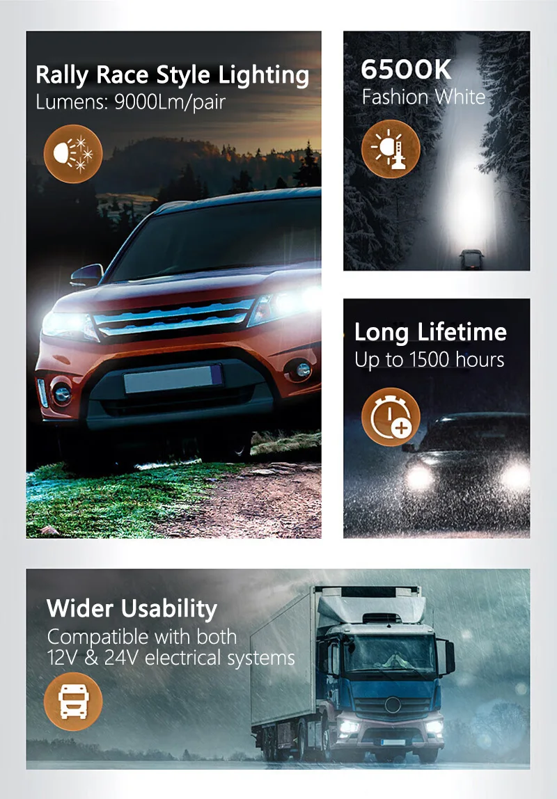 - High power for better vision, 50W per bulb, 100W per pair, 4500LM per bulb, 9000LM per pair