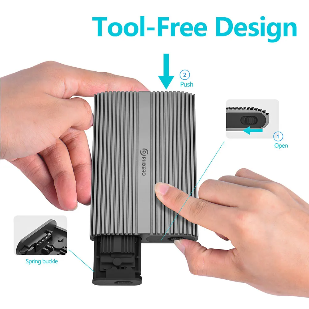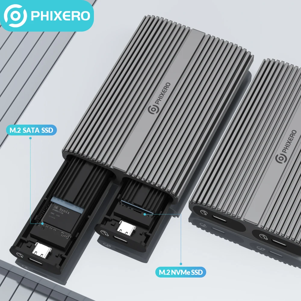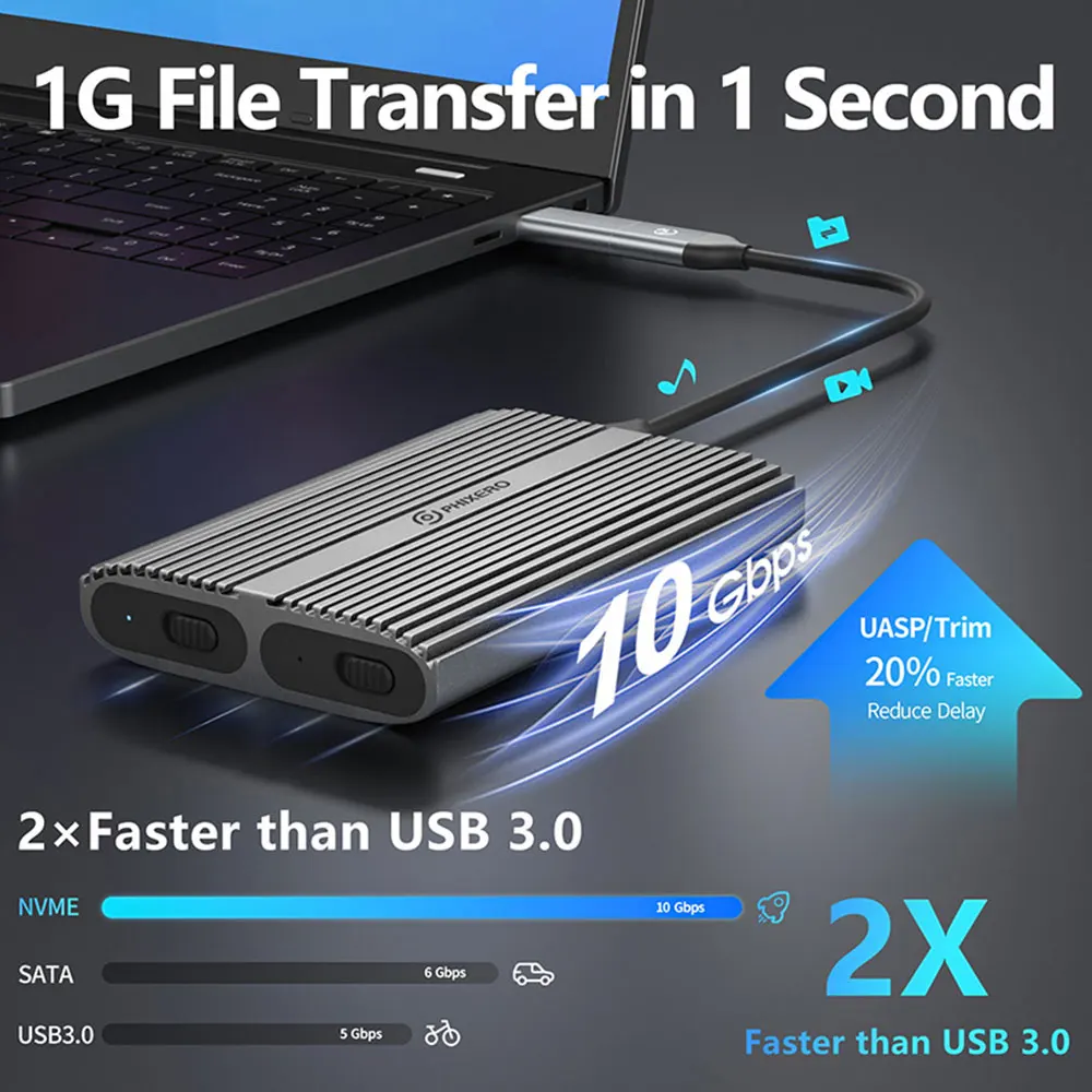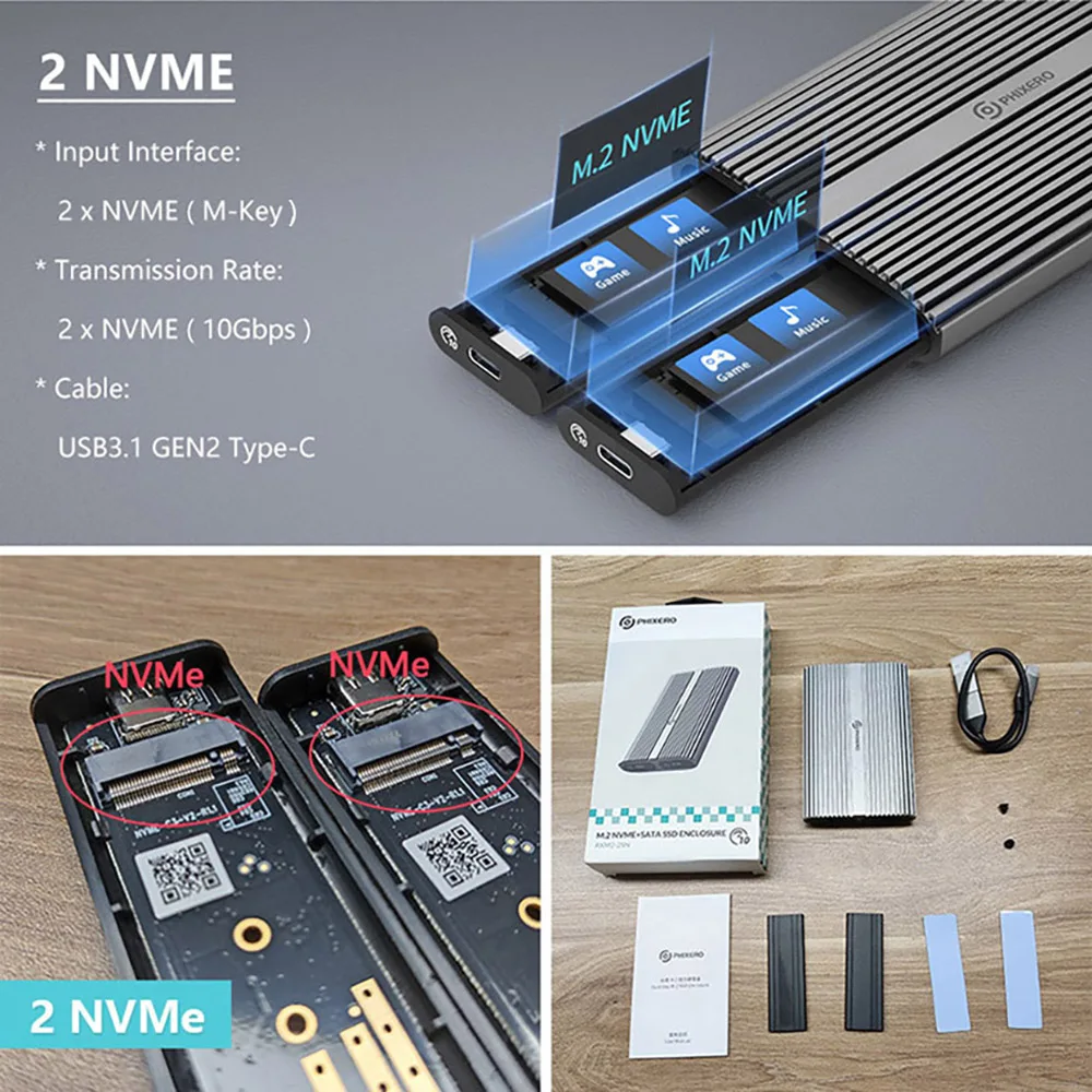 【Carcasa NVMe de dos compartimentos】- Los gabinetes SSD NVMe M.2 de dos compartimentos PHIXERO admiten la ejecución de un solo SSD de forma independiente o la conexión de dos cables simultáneamente para leer dos SSD.Cómoda clasificación de datos con mayor capacidad.