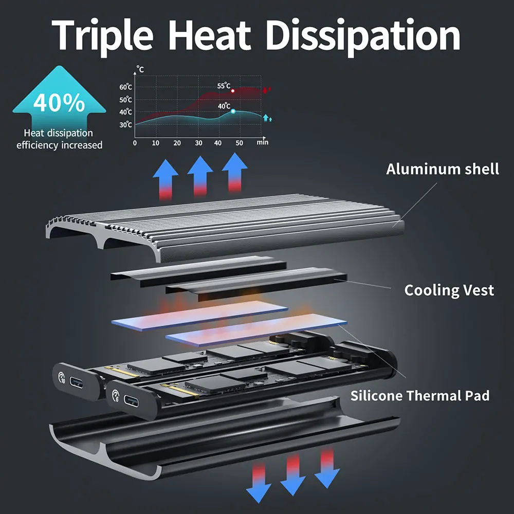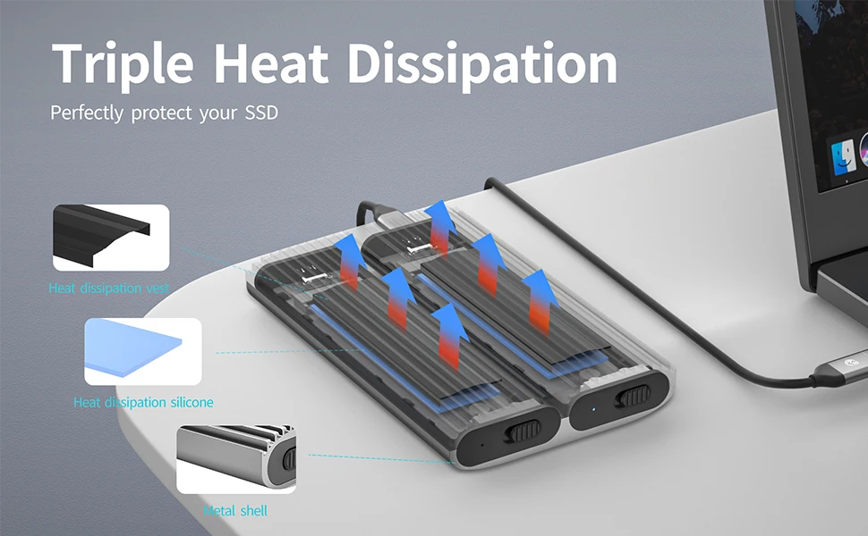 【Triple disipación de calor】- La carcasa SSD M.2 adopta una carcasa de aleación de aluminio de alta dureza, un chaleco de enfriamiento de aleación de aluminio incorporado y una almohadilla térmica de silicona.La eficiencia de enfriamiento aumenta en un 40%, protegiendo su SSD contra el sobrecalentamiento y el tartamudeo al transferir archivos grandes o jugar juegos y prolongar la vida útil.