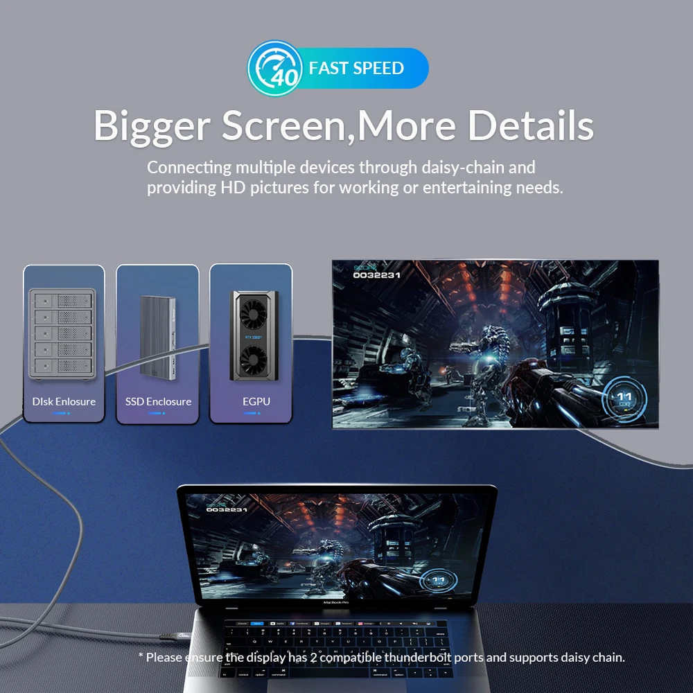 Compatible con el cable Thunderbolt 4 admite una velocidad de hasta 40Gbps. En teoría, los datos 3G se pueden transmitir en 1 segundo. En teoría, los datos 3G se pueden transferir en 1 Segundo, que es 2 veces más rápido que para Thunderbolt 2, 4 veces más rápido que USB 3,1 y 8 veces más rápido que USB 3,0.
