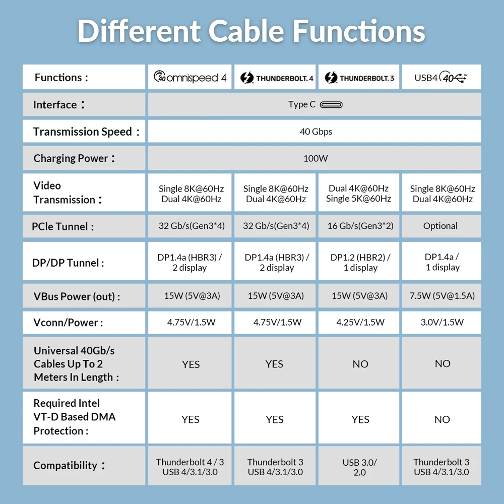 R: Físicamente, ambas son interfaces tipo C y admiten una velocidad de transmisión de 40Gbps y una potencia de salida de 100W, que difieren principalmente en la resolución de transmisión de video y la transmisión de datos PCle.