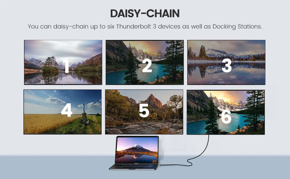 Puede conectar en cadena hasta seis para dispositivos Thunderbolt 3, así como para estaciones de acoplamiento. Asegúrese de que la pantalla tenga 2 puertos Thunderbolt y admita la cadena de margaritas