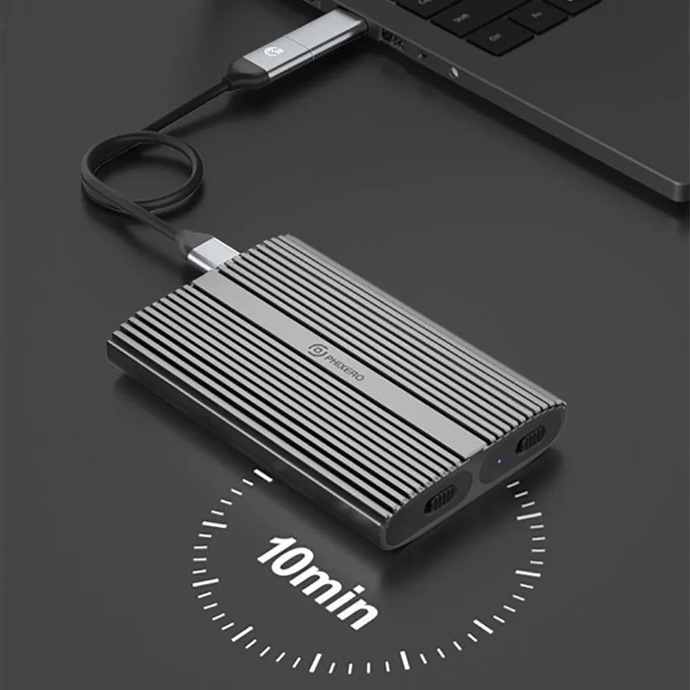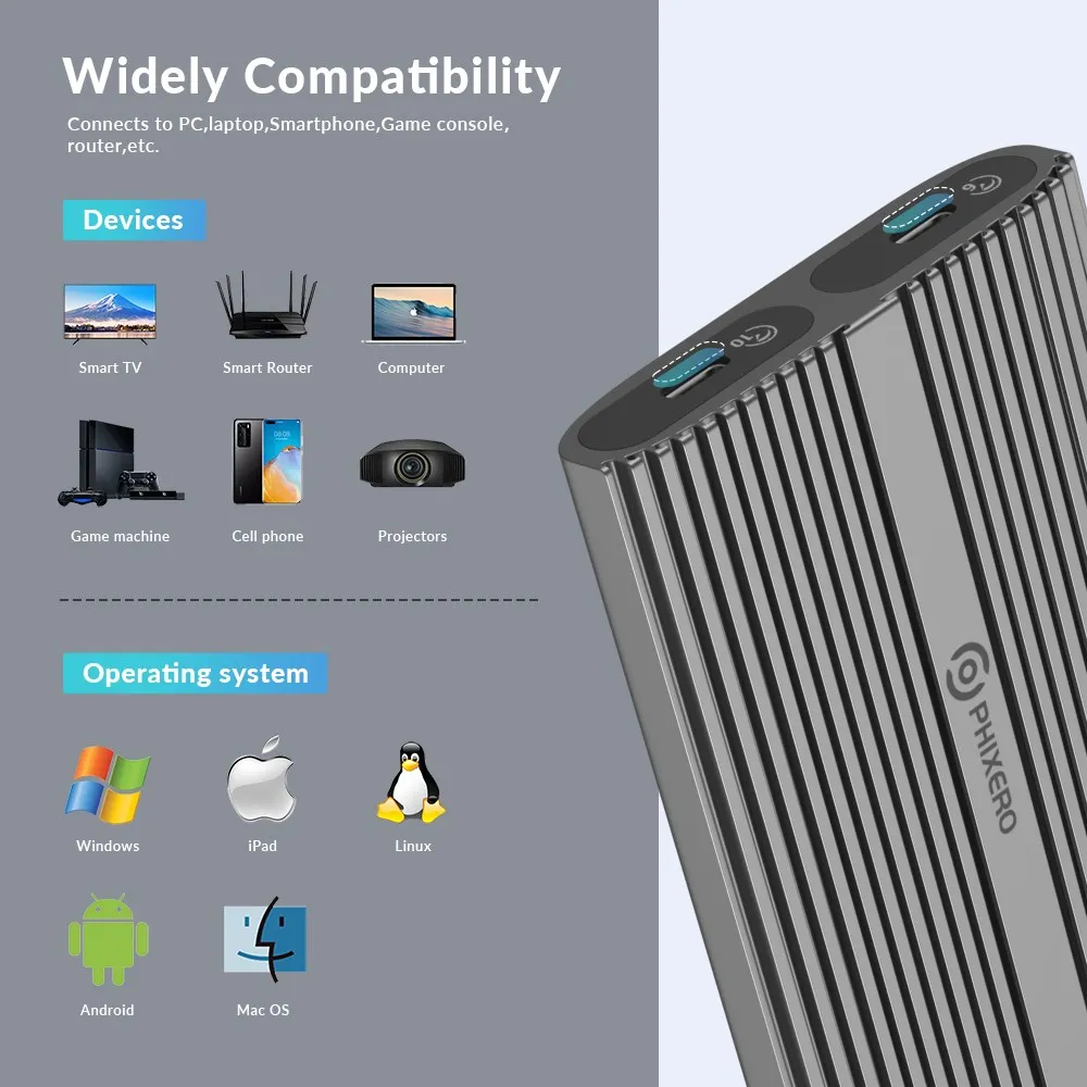 【Dual-bay NVMe Enclosure】- PHIXERO dual-bay M.2 NVMe SSD enclosures supports running a single SSD independently, or connecting two cables simultaneously to read two SSDs. Convenient data classification with larger capacity.