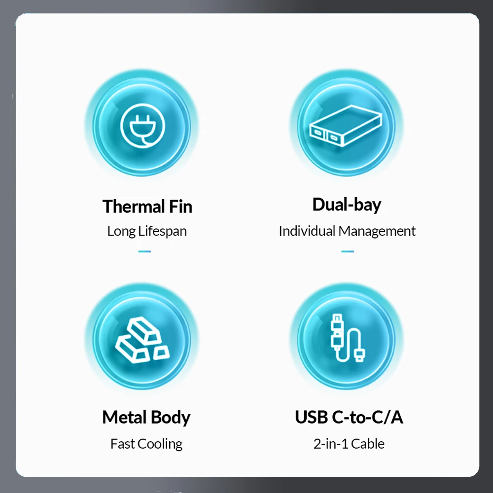 Tip :Two data lines are delivered, and the dual-bay hard drive box can be used at the same time ~
