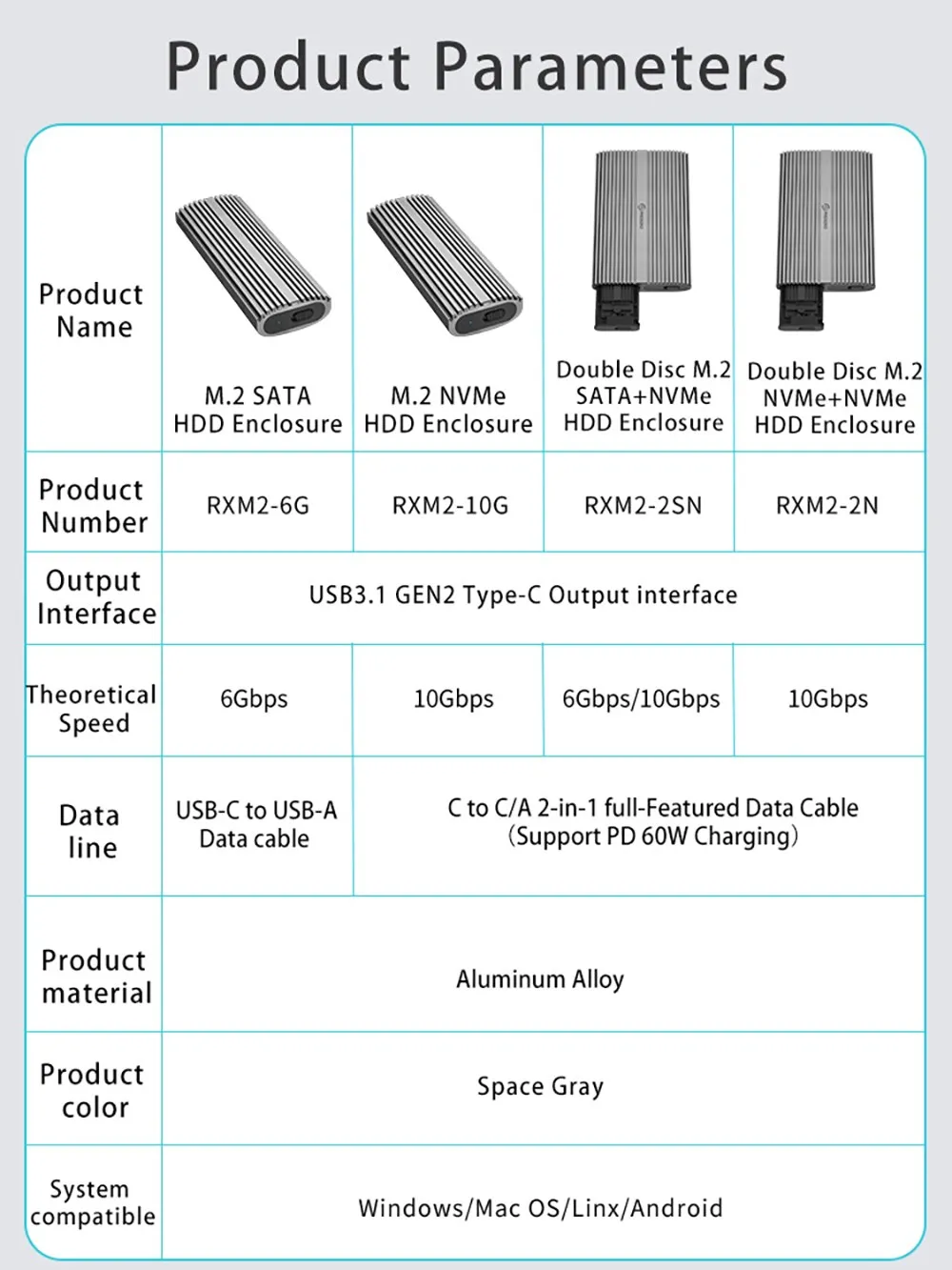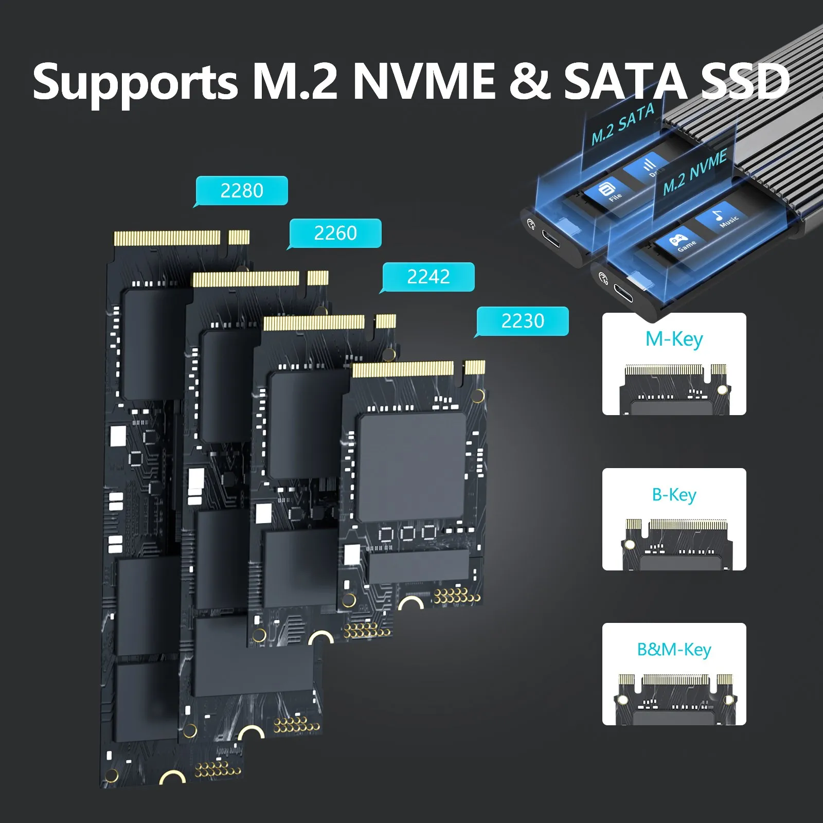 Only support NVMe PCI-E protocol M key/M&B Key SSD, with 30cm C to C/A 2-in-1 date Cable.