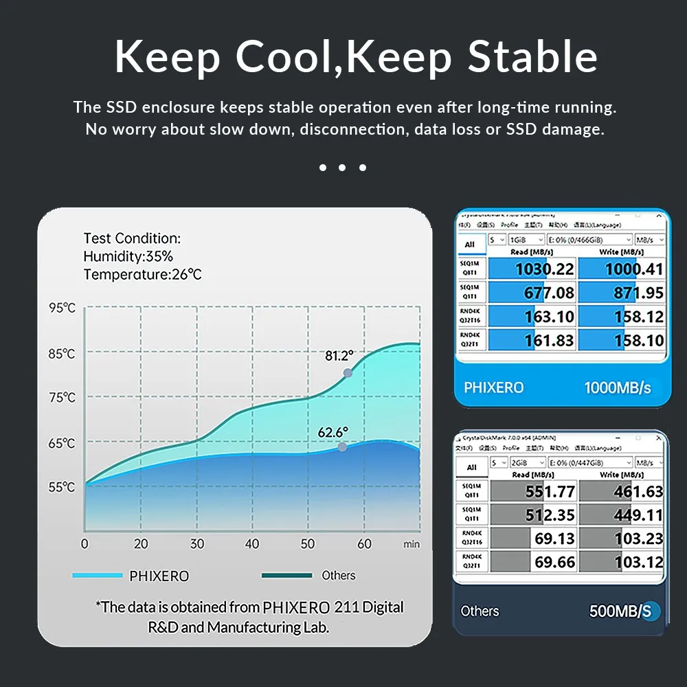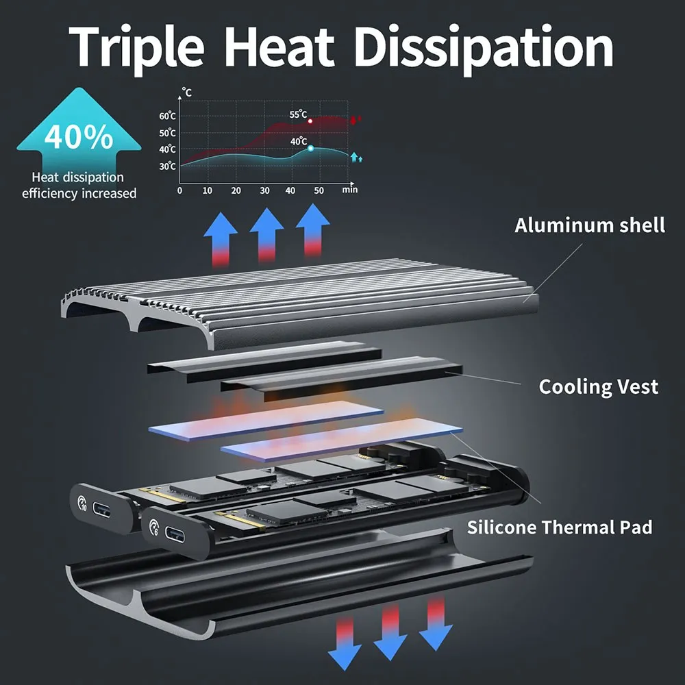 【Triple Heat Dissipation】- M.2 SSD enclosure adopts high hardness aluminum alloy shell, built-in aluminum alloy cooling vest and silicone thermal pad. The cooling efficiency is increased by 40%, protecting your SSD from overheating and stuttering when transferring large files or playing games and prolonging the lifespan.