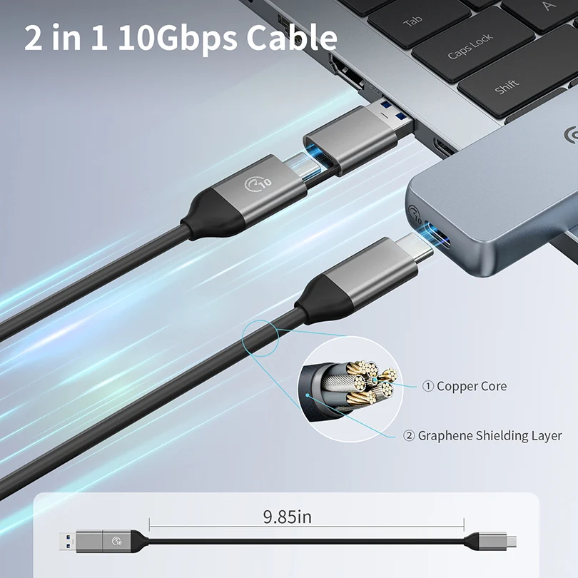 Todo el paquete incluye 2 en 1 Cable de 10Gbps, hacer transferencias más rápidas.