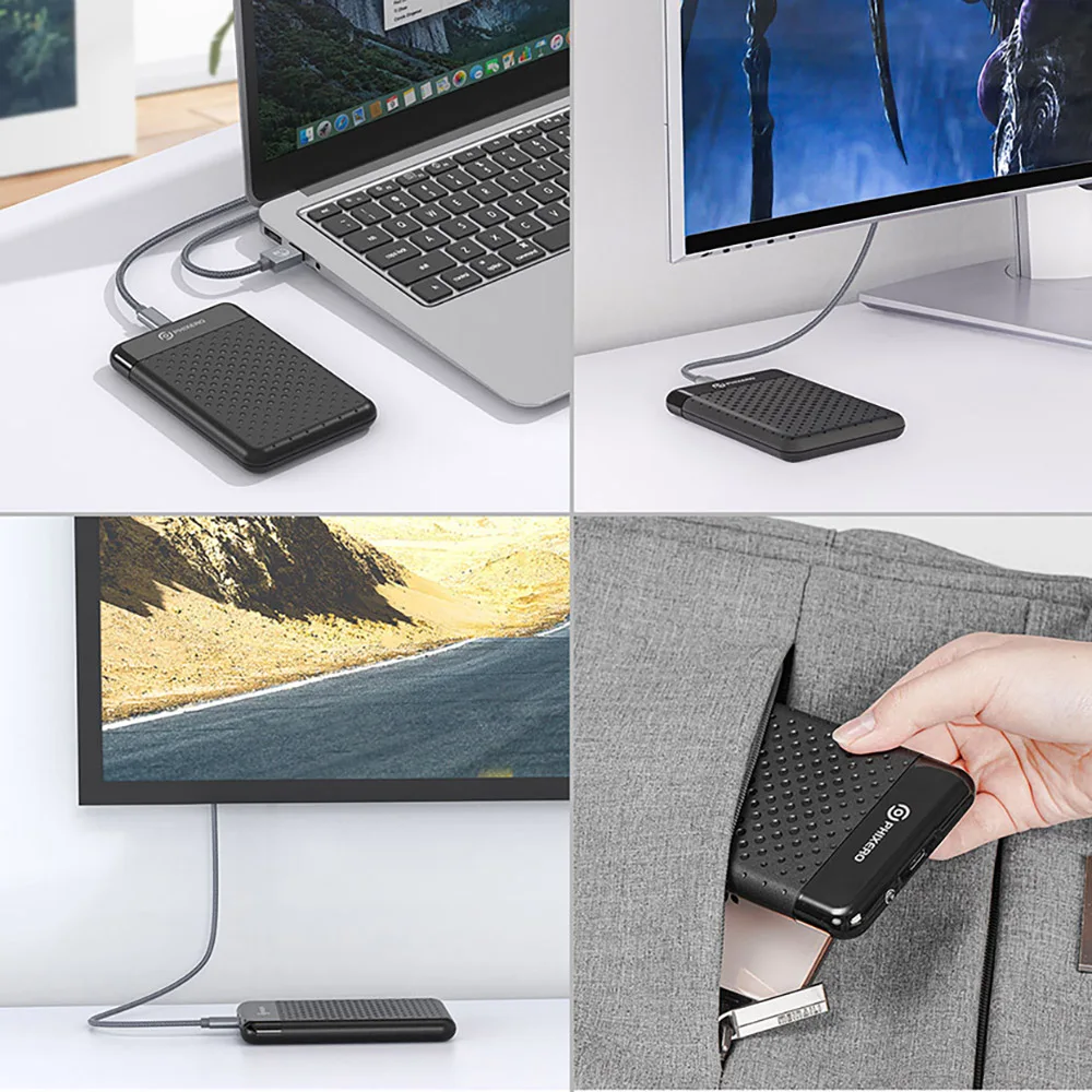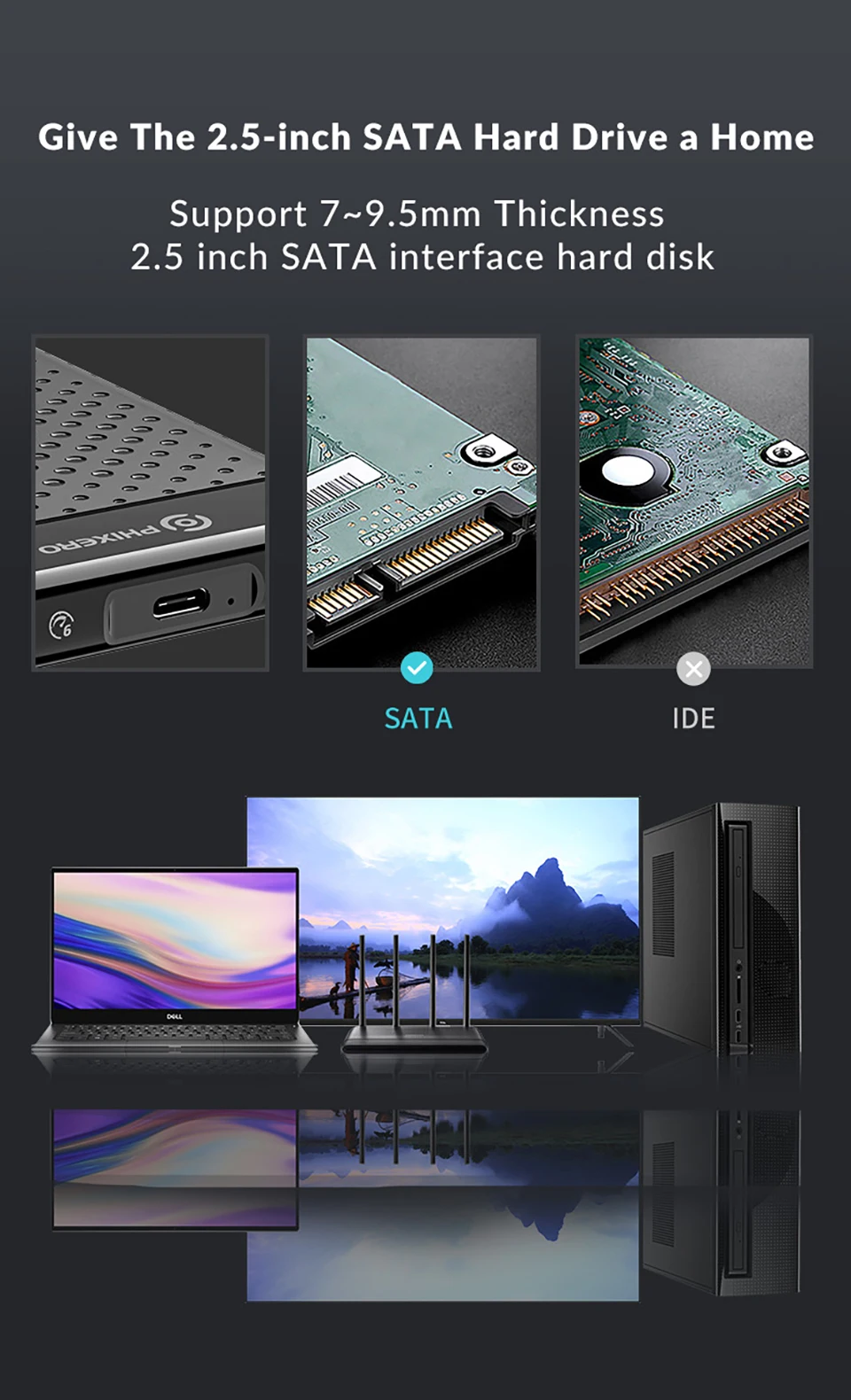 2.5 inch external hard drive enclosure:PHIXERO 2.5 inch hard drive enclosure can easily connect your 2.5 inch SSD & HDD to a PC, laptop, game console, router for data transfer. It is great for booting old HDD/SSD and restoring important files from defective PCs. And it protects your hard drive from external scratches and is easy to carry.