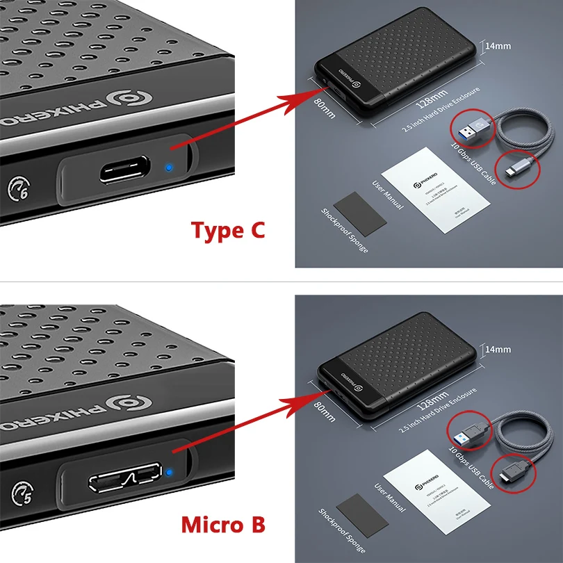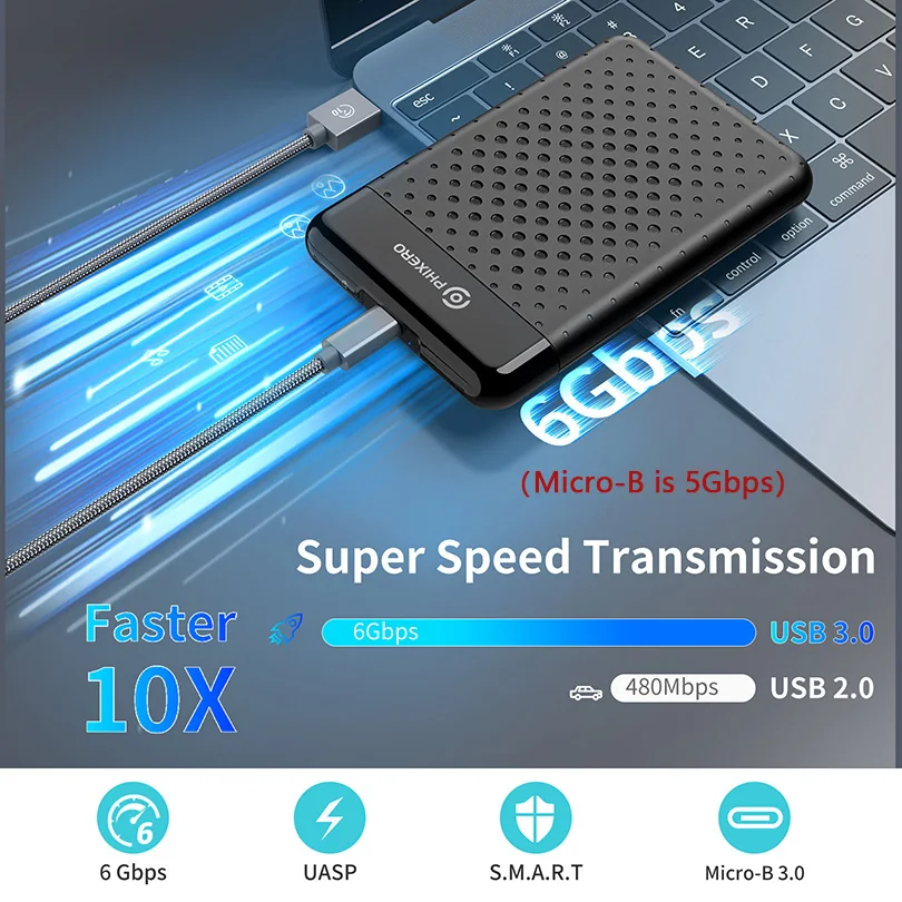 PHIXERO 2.5" Inch SATA SSD External Case USB 3.0 HDD Drive Enclosure Type C UASP 5Gbps 6Gbps USB3.0 SATA3 Storage Box Housing PC