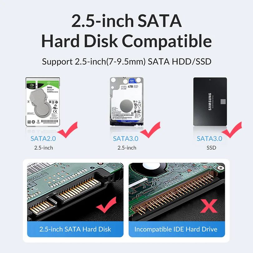 Suitable For All 2.5 inch SATA HDD/SSD , Thickness 7mm-9.5mm Hard Disk.