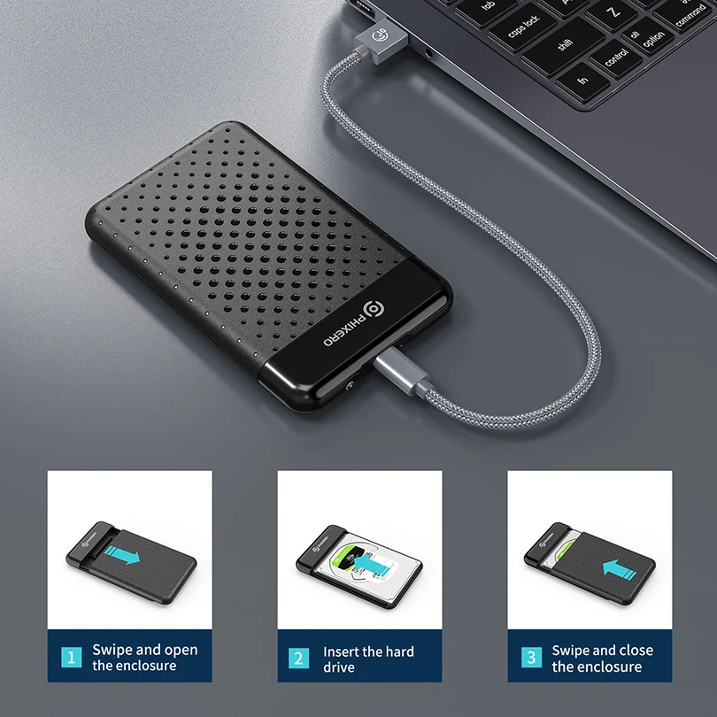 2.5 inch external hard drive enclosure:PHIXERO 2.5 inch hard drive enclosure can easily connect your 2.5 inch SSD & HDD to a PC, laptop, game console, router for data transfer. It is great for booting old HDD/SSD and restoring important files from defective PCs. And it protects your hard drive from external scratches and is easy to carry.