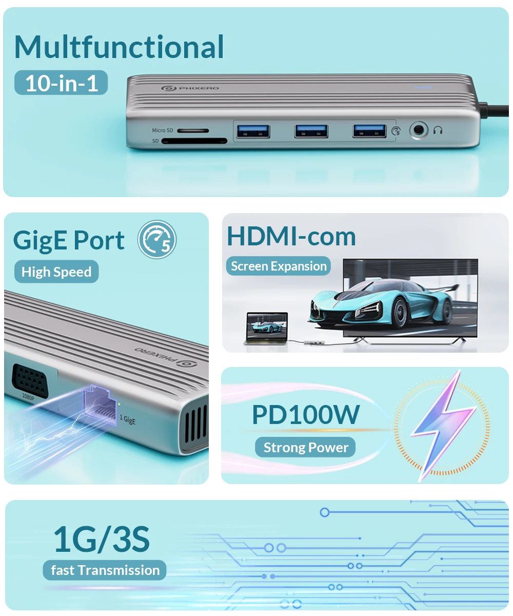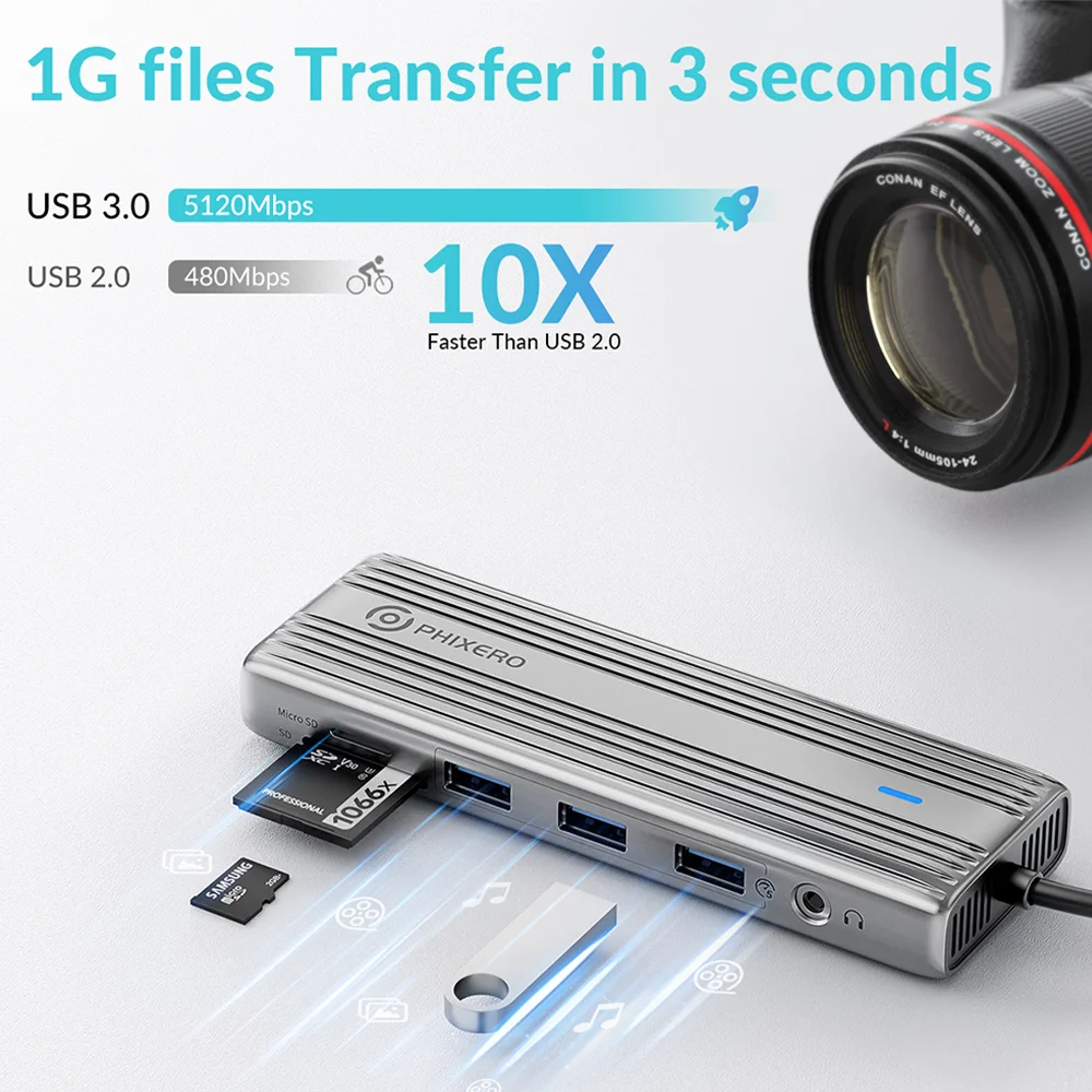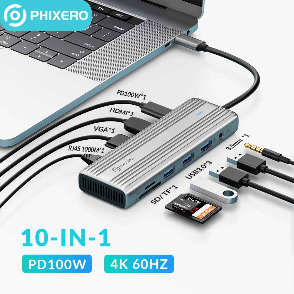 Comprar PHIXERO-concentrador de puertos Usb 3,0, estación de acoplamiento de alta velocidad, 4K, 60Hz, Compatible con HDMI, carga PD100W, RJ45