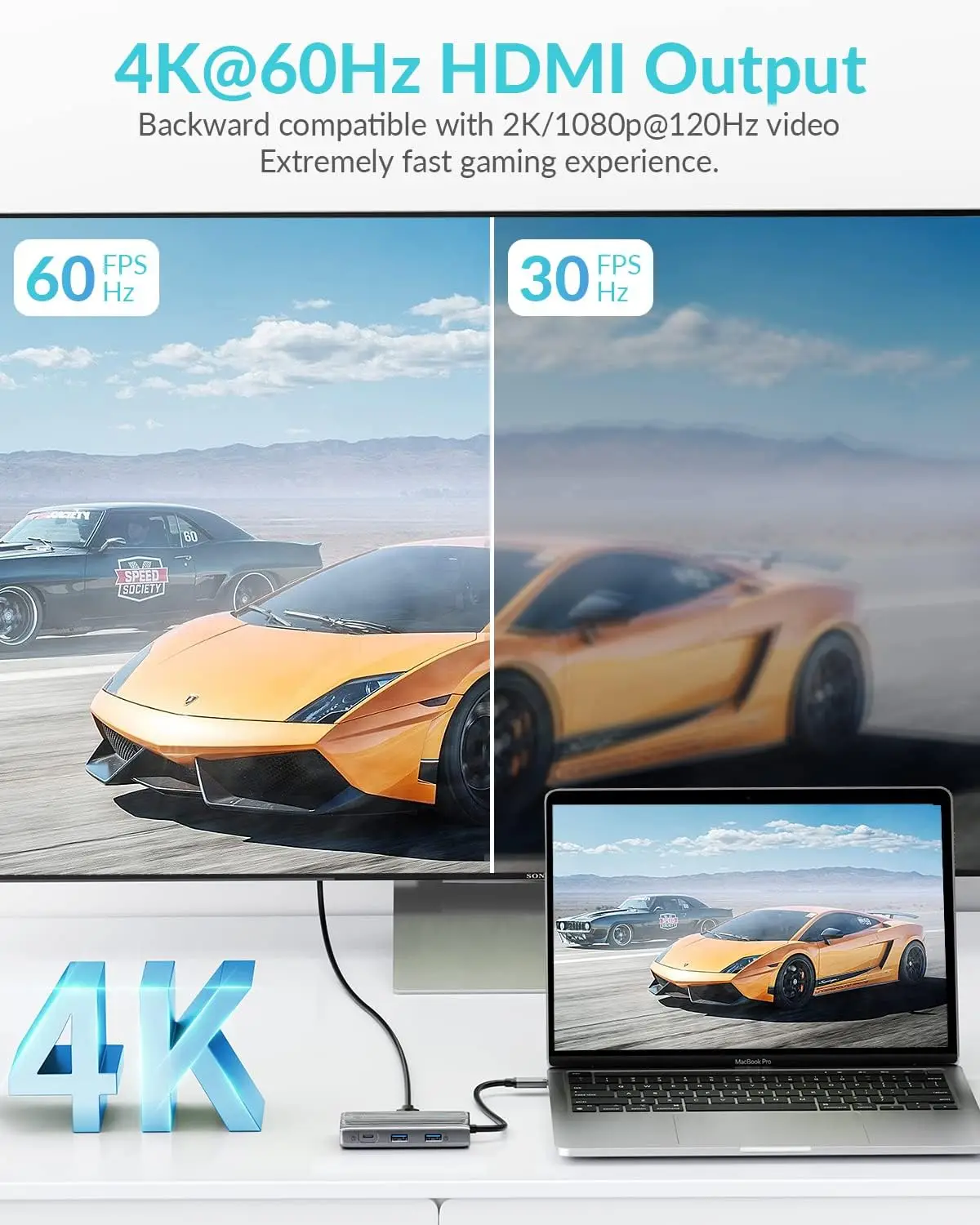 USB C Hub HDMI admite pantallas multimedia con resoluciones de hasta 4K @ 60Hz UHD o vídeo ultrarrápido 2K/1080p @ 120Hz, se refleja perfectamente o extiende la pantalla a televisores o monitores HDMI. No más retrasos, ya sea una reunión en línea o juegos, no te perderás ni un segundo. (Nota: 4K @ 60Hz solo se aplica a dispositivos habilitados para modo alternativo DP1.4