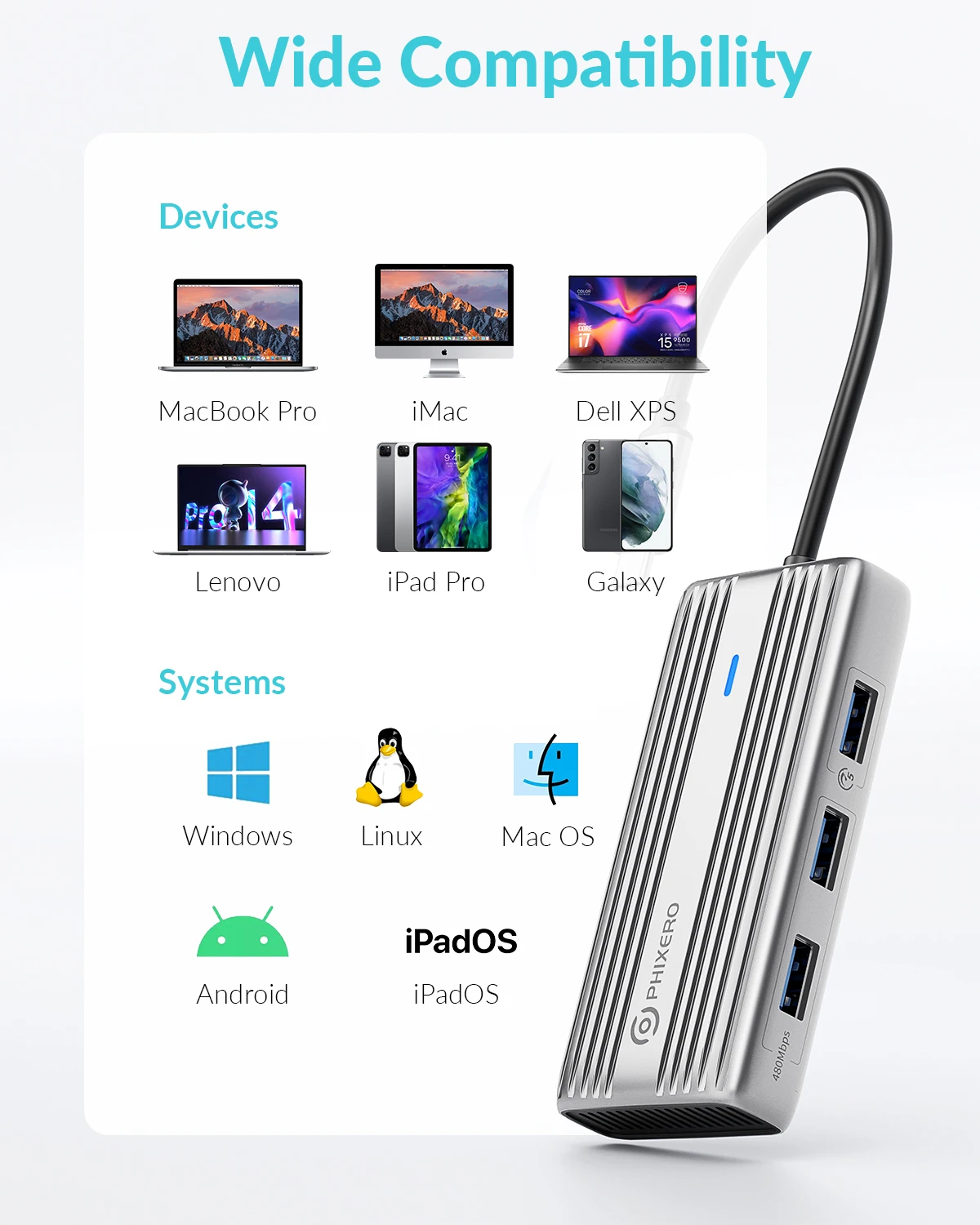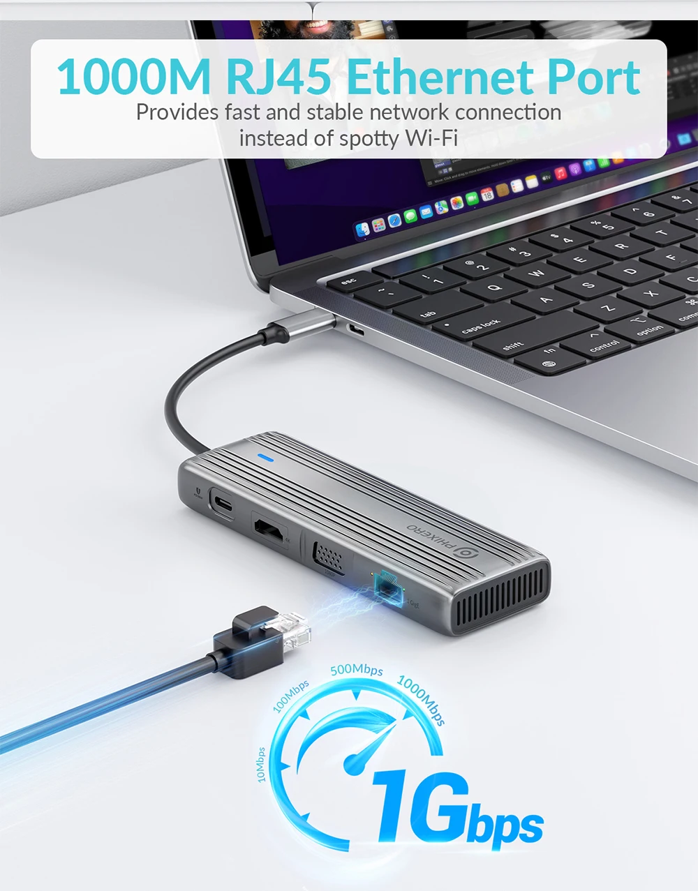 Con un puerto máximo RJ45 de 1000Mbps, PHIXERO USB C HUB ETHERNET proporciona una conexión de red rápida y estable cuando se navega en línea, en lugar de Wi-Fi detectado