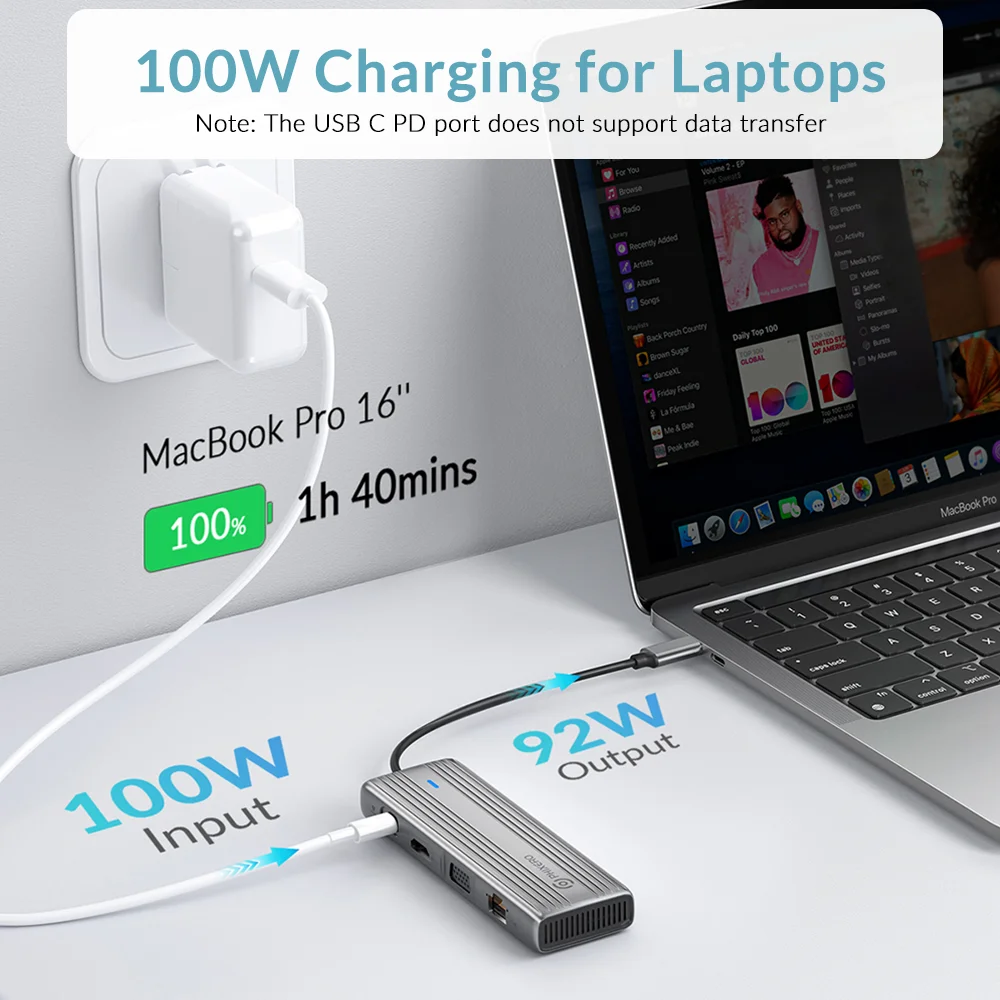 Utilizando un chip inteligente actualizado, la entrega de energía del concentrador USB C ofrece hasta 100W de potencia, lo que permite que la computadora portátil se cargue a alta velocidad al usar todas las demás características del concentrador. Suficiente potencia mantiene el disco duro y múltiples periféricos conectados al puerto USB funcionando a toda velocidad.
