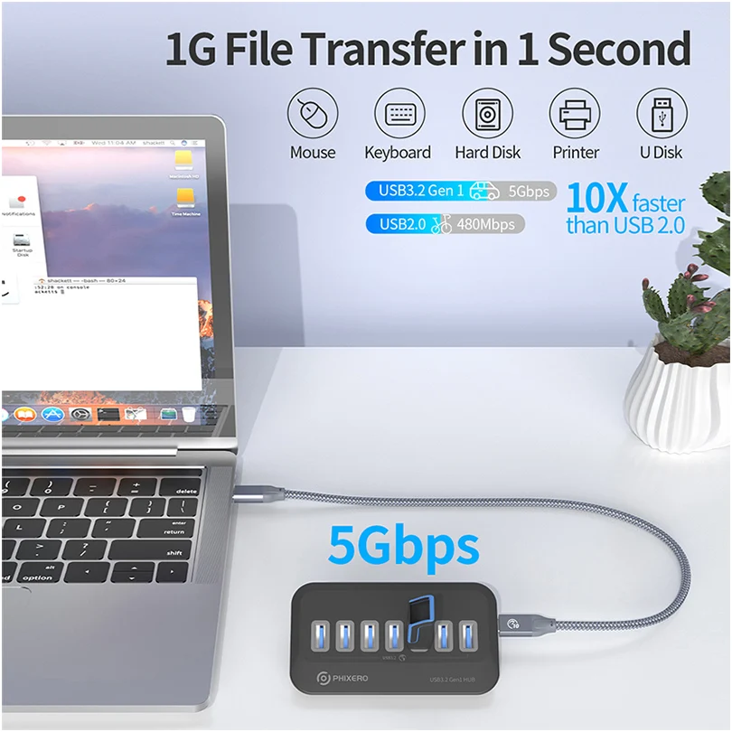 Admite una transferencia de datos súper rápida de hasta 5Gbps, 10 veces más rápida que USB 2,0.