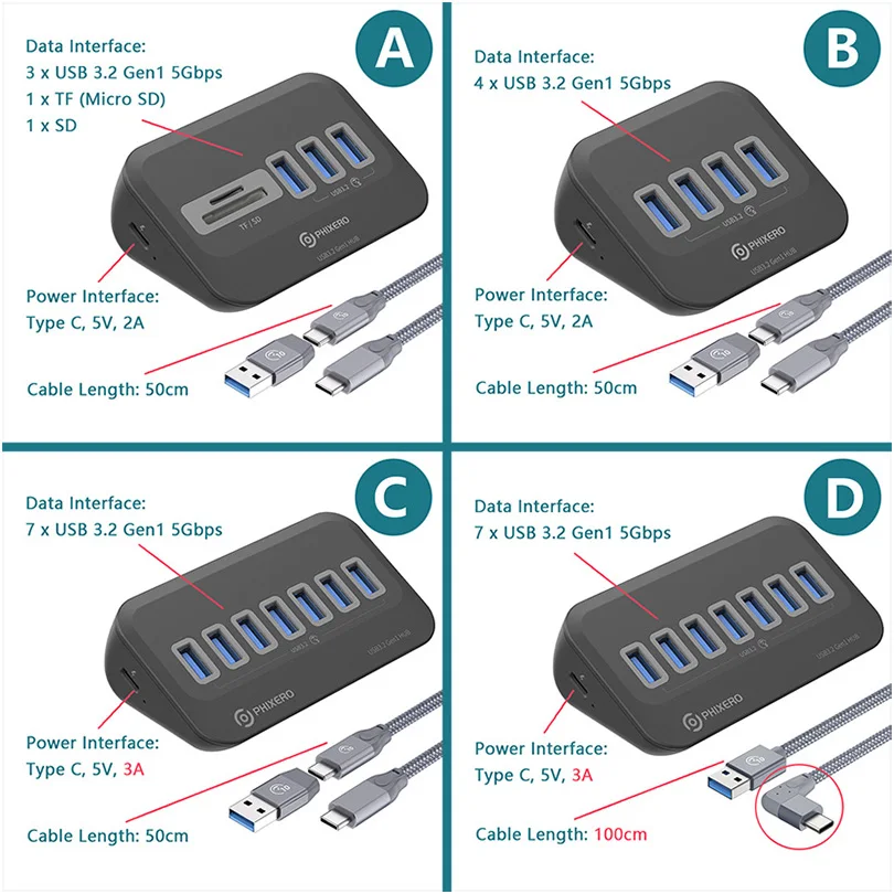 3. Para "A", la velocidad del puerto USB es de 5Gbps, pero la velocidad del puerto TF/SD es de solo 480Mbps.