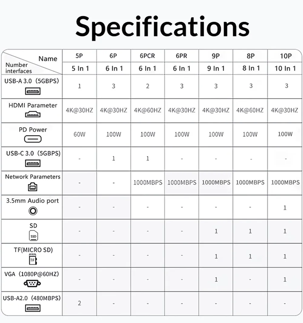 1. Grey 5in1 30Hz PD60 : USB-A*1(5Gbps) + USB-A*2(480Mbps)+ PD60W*1+HDMI-compatible*1(4K@30Hz)