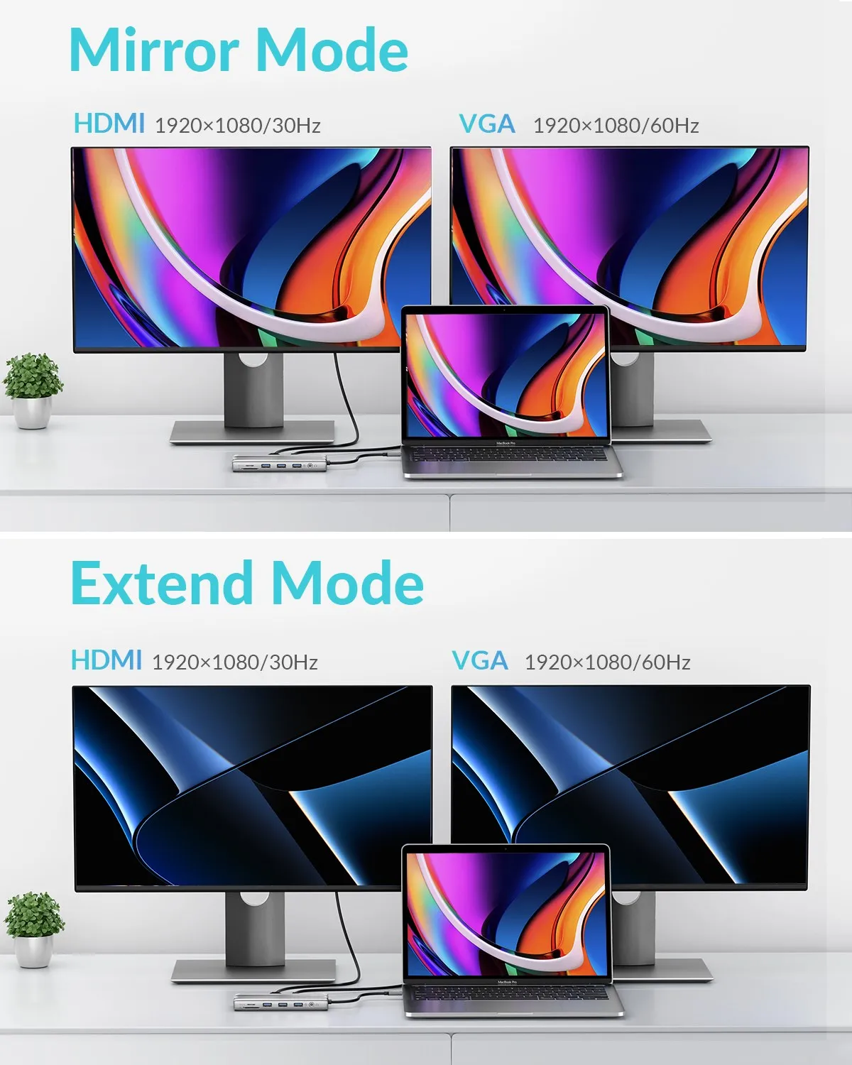 6.Grey 9in1 30Hz VGA : USB-A*3(5Gbps) + SD&TF*1 + HDMI-compatible*1(4K@30Hz)+ VGA*1(1080P) + RJ45(GigE)*1 + PD100W*1