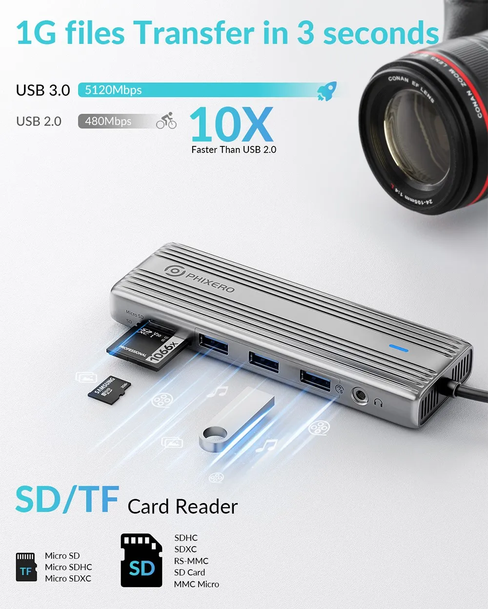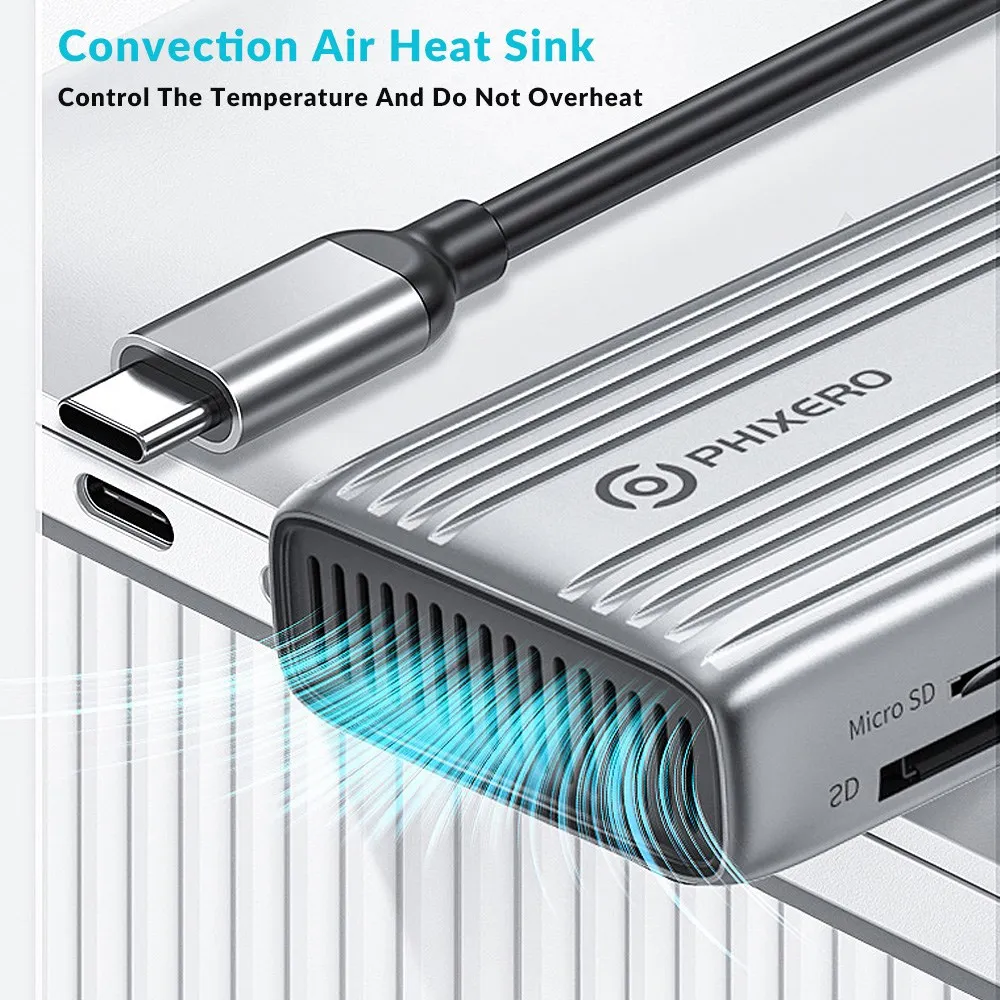 Built-in SD and TF slots easily access files from universal SD card and Micro SD cards; this USB C Hub easily transfers photos or videos from your camera' cards to the laptop in seconds, so you can see and share your photos anywhere and anytime.