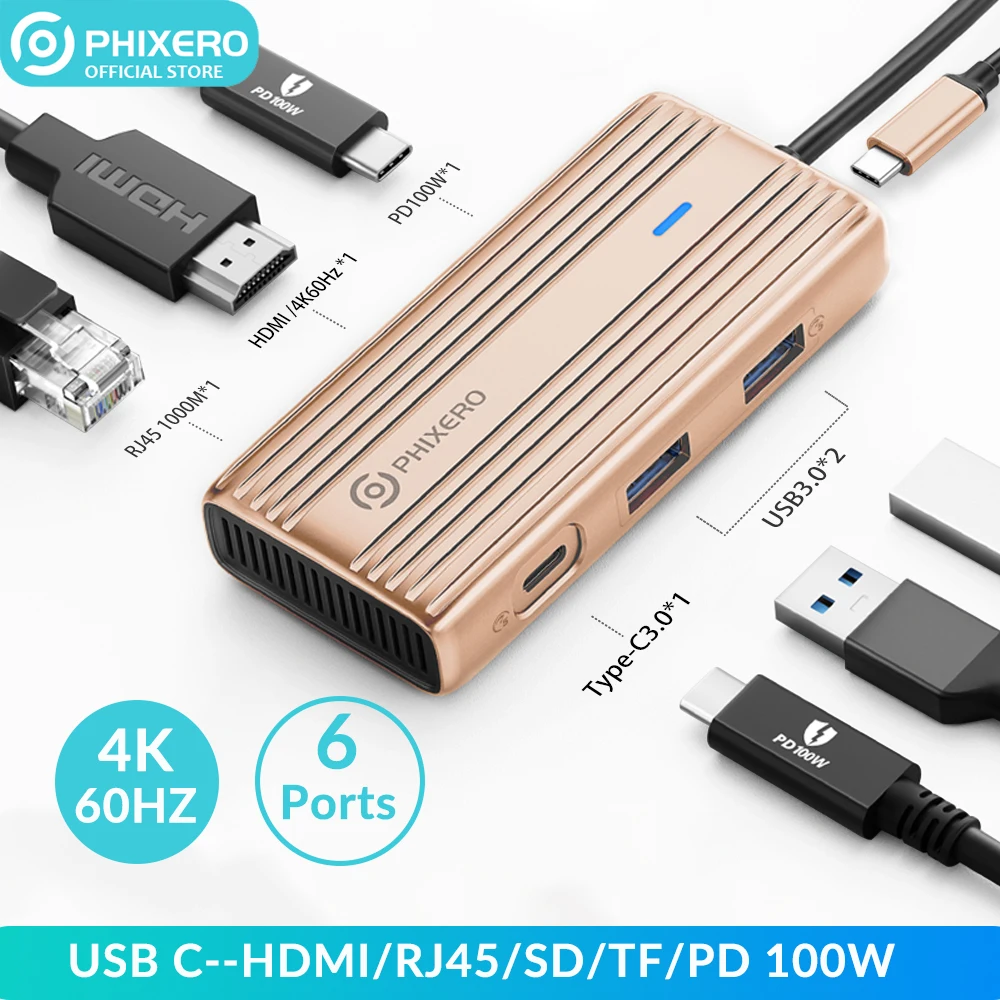 3.Gold 6in1 60Hz RJ45 : USB-A*2(5Gbps) + USB-C*1(5Gbps) + PD100W*1 + HDMI*1(4K@60Hz) + RJ45(GigE)*1