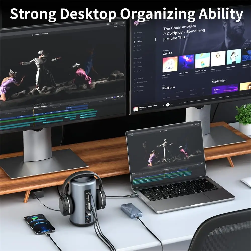Base Thunderbolt 3 16 en 1:PHIXERO USB C Thunderbolt Hub tiene 2 x Thunderbolt 3 puertos (40 Gbps), puerto DP (8 K @ 30Hz), 2 x USB C (10 Gbps), USB 3,1 (10 Gbps), 2 x USB 2,0, Puerto Gigabit Ethernet, ranura para tarjeta SD/Micro SD. S/PDIF, Audio/micrófono de 3,5mm y potencia de entrada de 65W. Combina perfectamente todas las características que necesitas. El diseño de la columna es antivuelco, se puede utilizar como soporte para auriculares, estación de acoplamiento ideal para el escritorio.