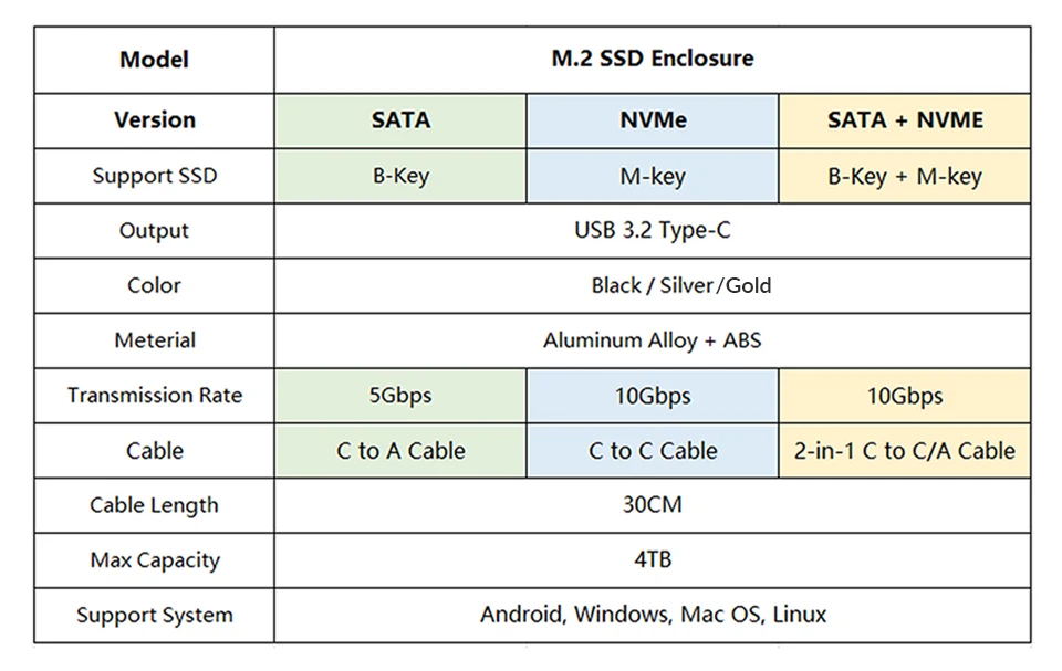 Their Compatible SSD, Transmission Rate and Cable Are Different, Please Choose Carefully.