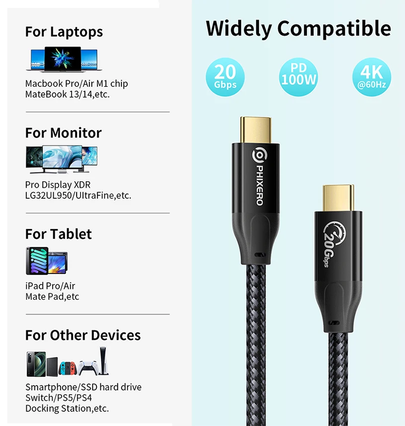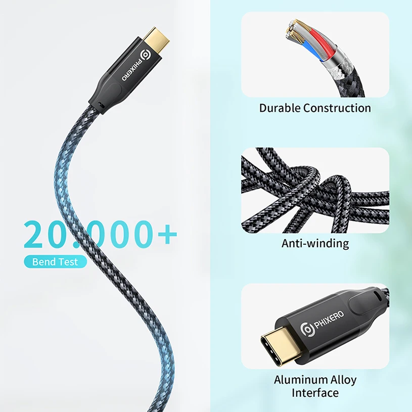 PHIXERO PD 100W USB 3.2 Cable de carga rápida tipo C 3 20Gbps Cable de extensión de alta velocidad 20V 5A carga Kabel 4K 60Hz línea de cargador